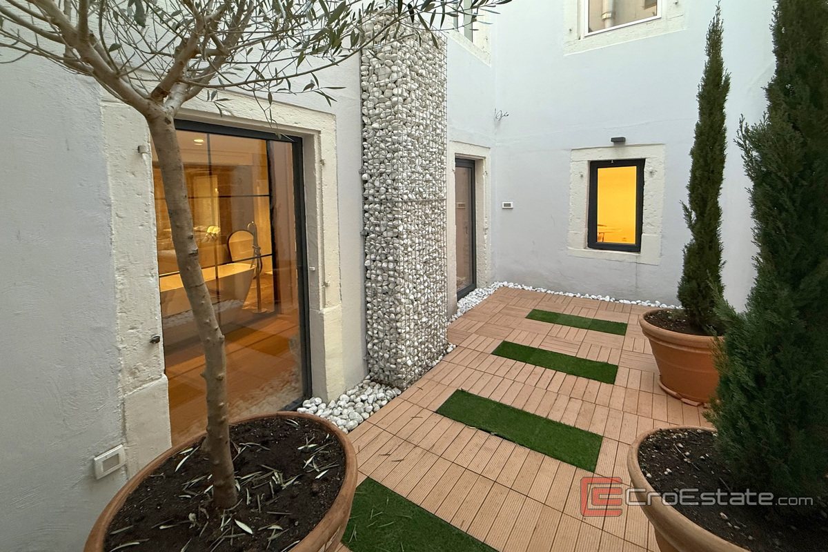 Trappen fører til leiligheten og strekker seg fra hovedpromenaden i Šibenik hele veien til den direkte inngangen til leiligheten. Helt fra entréen utstråler leiligheten romslighet og mye naturlig lys. Leiligheten er ovalformet, i hjertet av denne er det en uvanlig åpen terrasse som gir direkte tilgang til alle rom og dermed mer dagslys. Fra inngangen strekker leiligheten seg på to sider, badet og rommet starter på høyre side, og i en sirkulær effekt går den over stuen og når kjøkkenet og spisestuen, som er forbundet med ytterligere to rom og en baderom. Leiligheten består av spisestue, kjøkken, stue, tre bad og tre soverom. En flott funksjon i denne leiligheten er terrassen. Dette spesielle elementet av stilig design løfter eiendommen effektivt til et høyere nivå og tilbyr eksepsjonelt privatliv og et luksuriøst interiørutseende. Denne plassen kan brukes som et sted å slappe av og bygge bro over grensen mellom det ytre og indre av eiendommen. En skånsom overgang mellom interiør og eksteriør gir et preg av natur i sentrum av leiligheten.