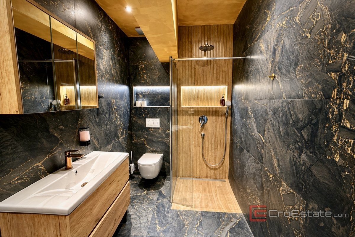 Denne frittliggende eiendommen med svømmebasseng og vakkert anlagt uteområde ligger i et rolig område i Split. Det totale bruksarealet er 164 m², og den ligger på en tomt på 364 m².