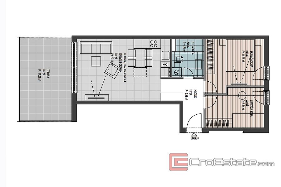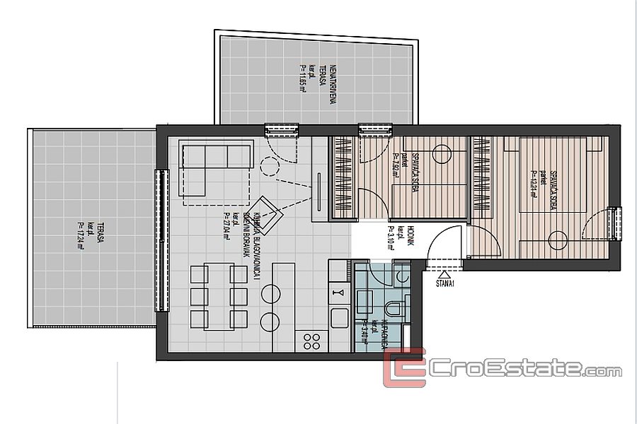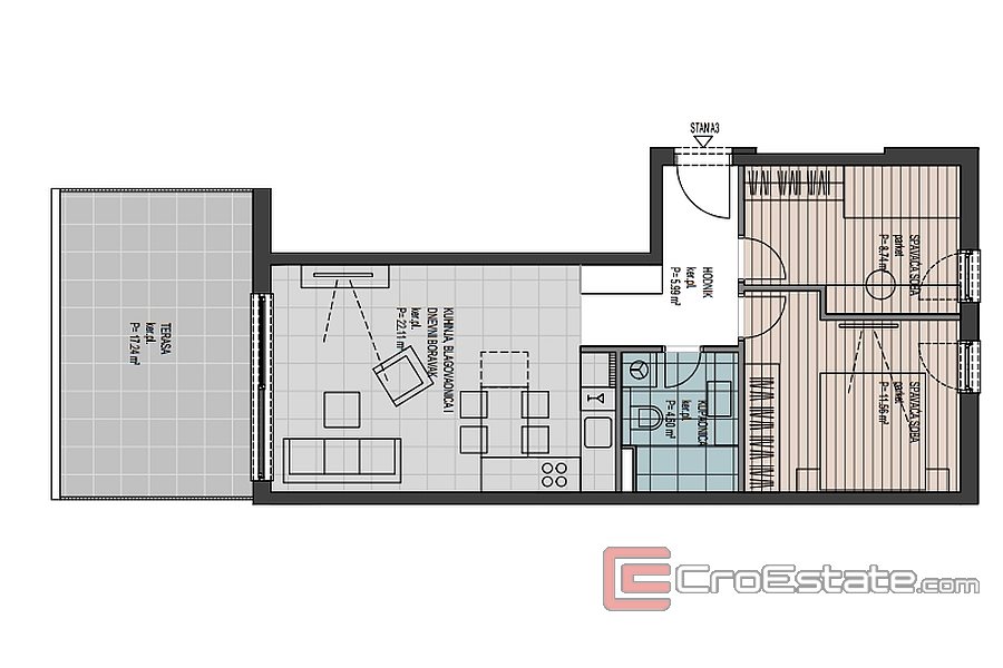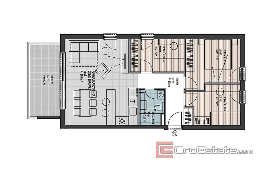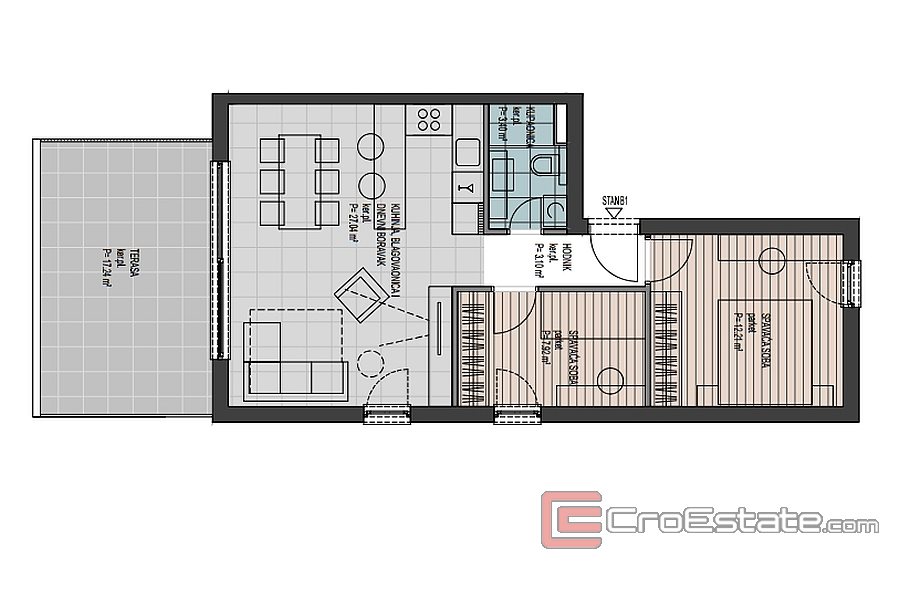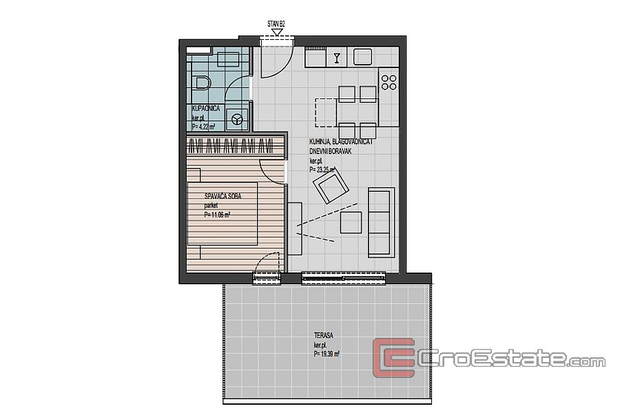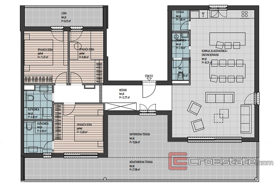 B13 - 105,29 m² + loggia 8,25 m² + overbygd terrasse 19,64 m² + utildekket terrasse 27,96 m² - 514 424 €