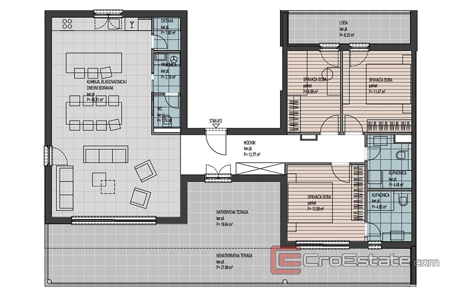 A13 - 105,29 m² + loggia 8,25 m² + overbygd terrasse 19,64 m² + utildekket terrasse 27,96 m² - 514 424 €