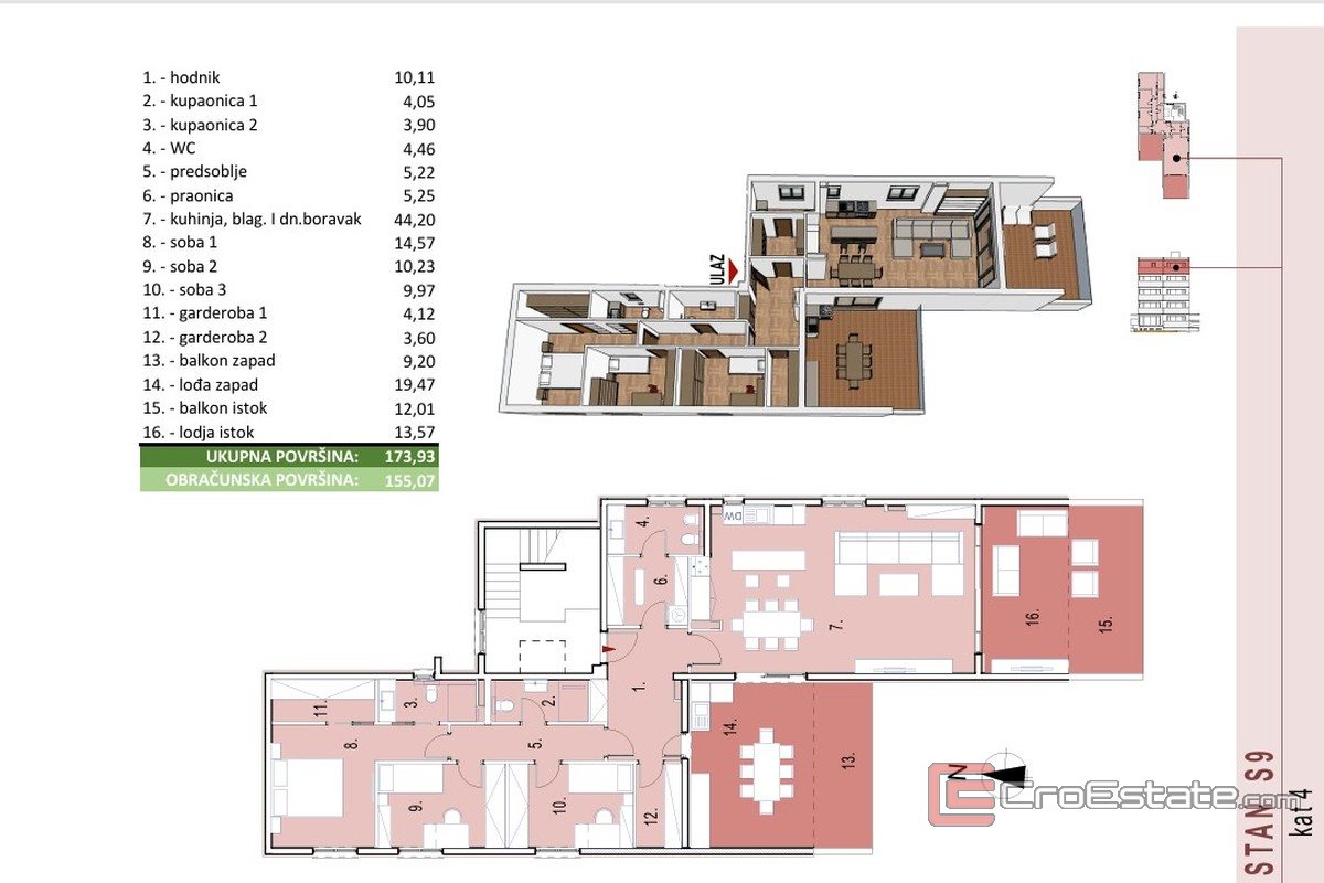 Den har 119,68 m² og består av tre soverom, to bad, toalett, gang, vaskerom, to garderober og kjøkken, spisestue og stue. Leilighetens eksteriør består av to loggiaer og to balkonger med et totalt areal på 54,25 m². Den største fordelen med leiligheten er nettopp denne eksteriøret, hvor ulike fasiliteter kan plasseres avhengig av kjøperens ønsker, samt basseng- og solbadeområdet, som er til felles bruk for alle leietakere. Leiligheten selges utstyrt med komplett belysning, sikkerhetsdører, videoporttelefon og fliser, samt førsteklasses sanitærfasiliteter. Oppvarming og kjøling skjer via fire klimaanlegg og gulvvarme på badene og i stuen. Det er to garasjeparkeringsplasser i kjelleren av bygningen.