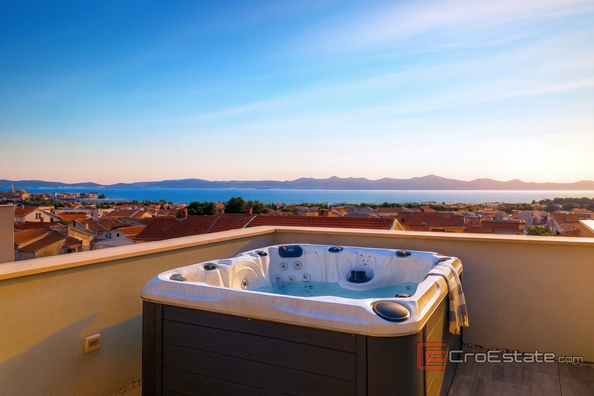 Til salgs er en romslig toppleilighet på 142 m2 beliggende i siste (tredje) etasje i et boligbygg med totalt seks leiligheter. Det ligger i byen Zadar.
