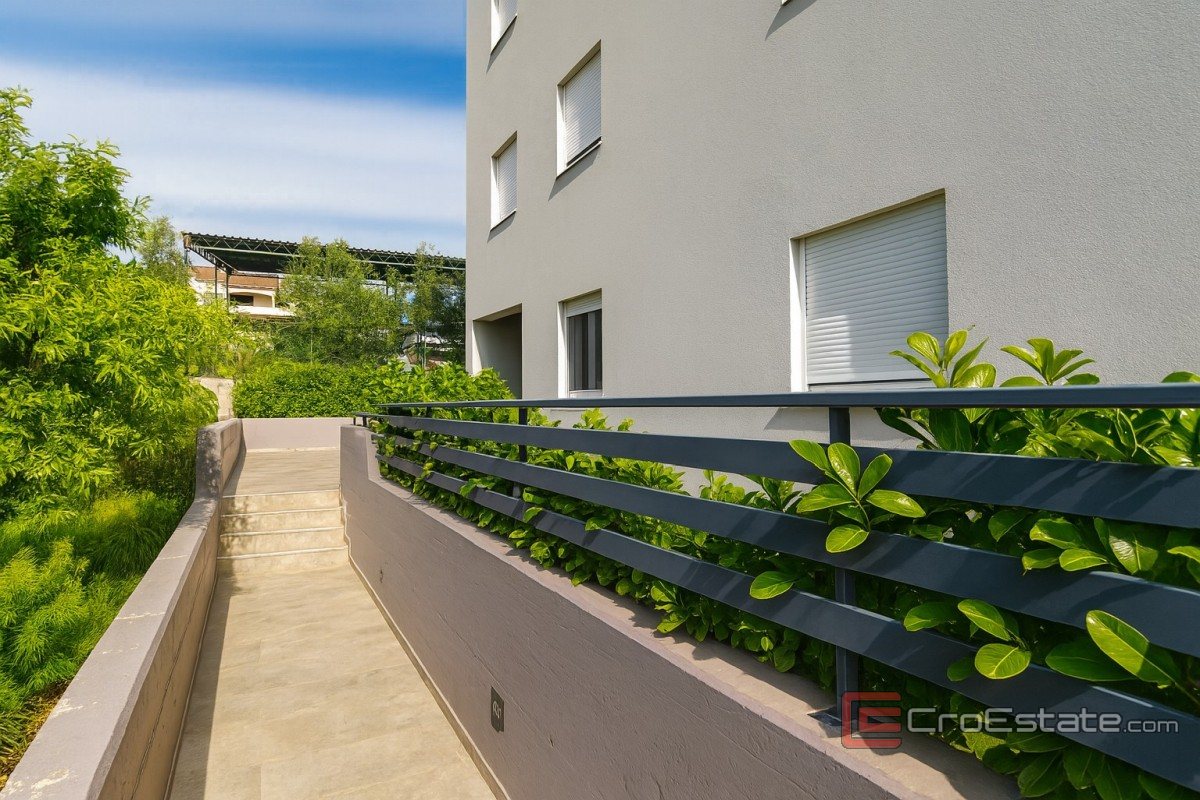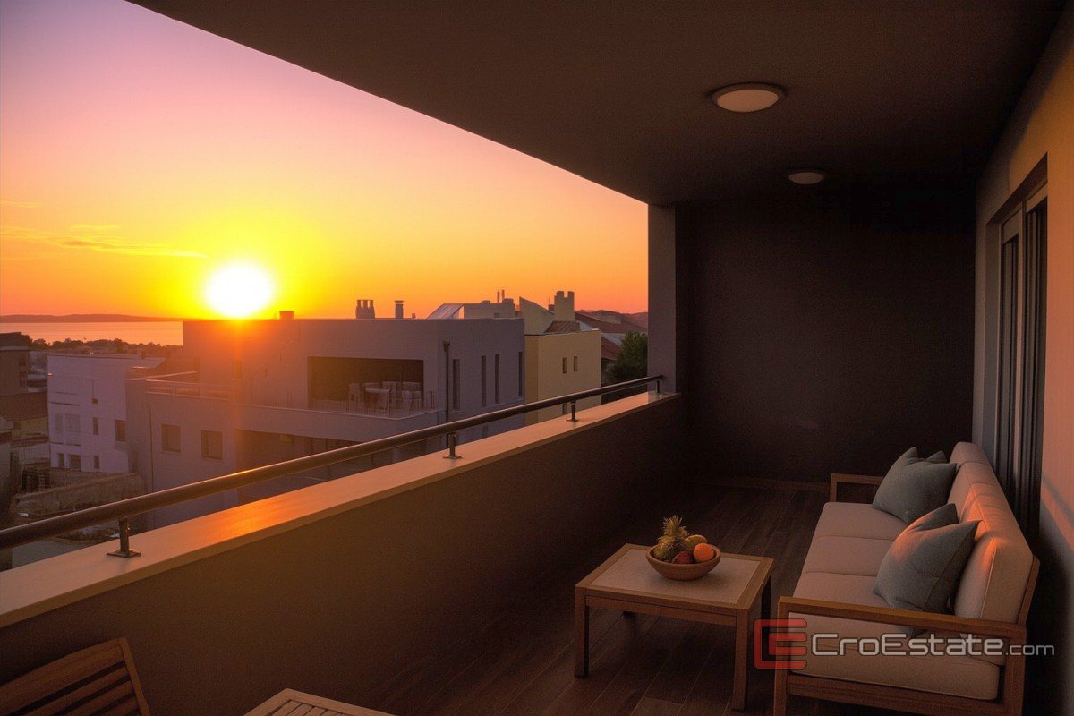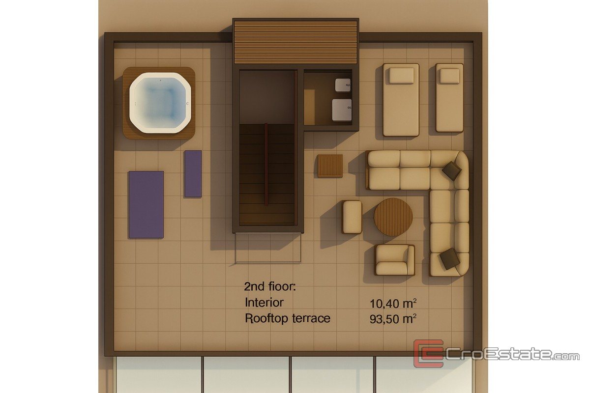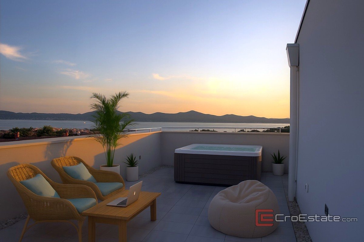 Leiligheten består av entré, kjøkken, stue og spisestue hvorfra det er utgang til overbygd terrasse på 16,30 m2. Leiligheten har tre soverom, bad og toalett. En intern trapp fører til en stor overbygd terrasse på 93,50 m2 med utsikt over Zadar sentrum og havet. Det er også et boblebad på terrassen.