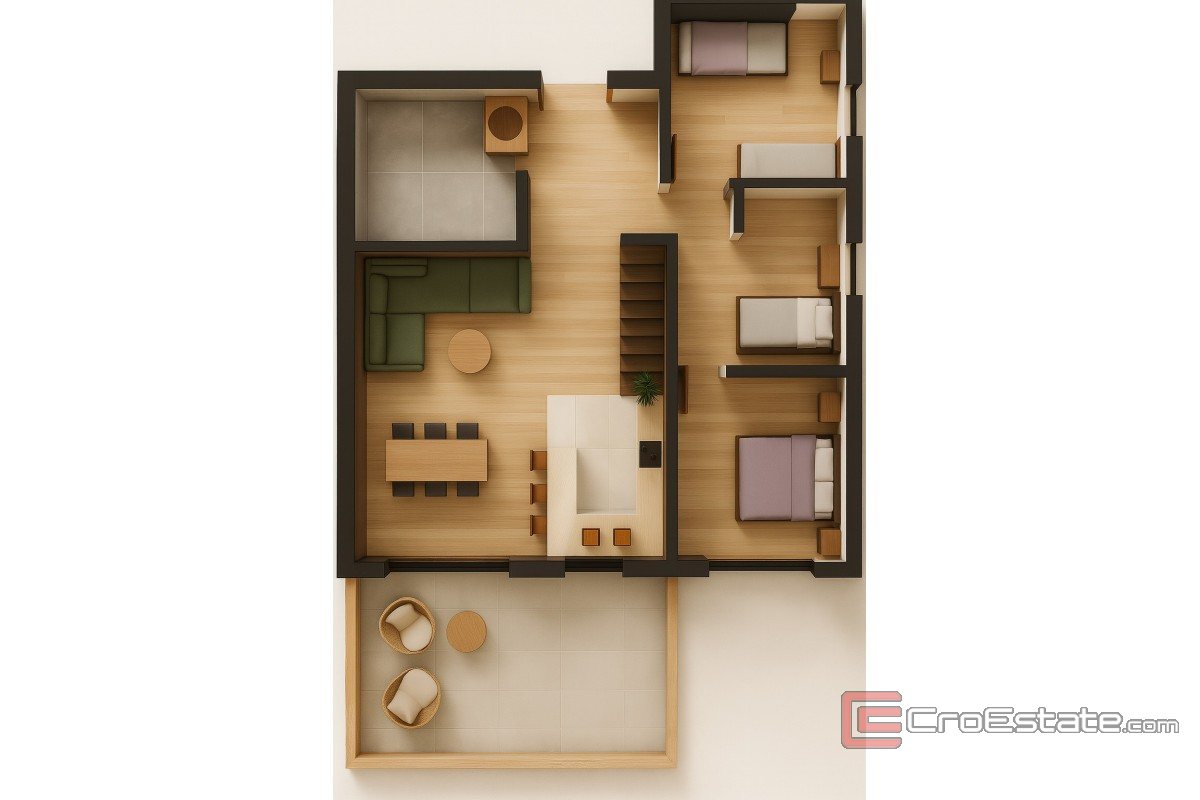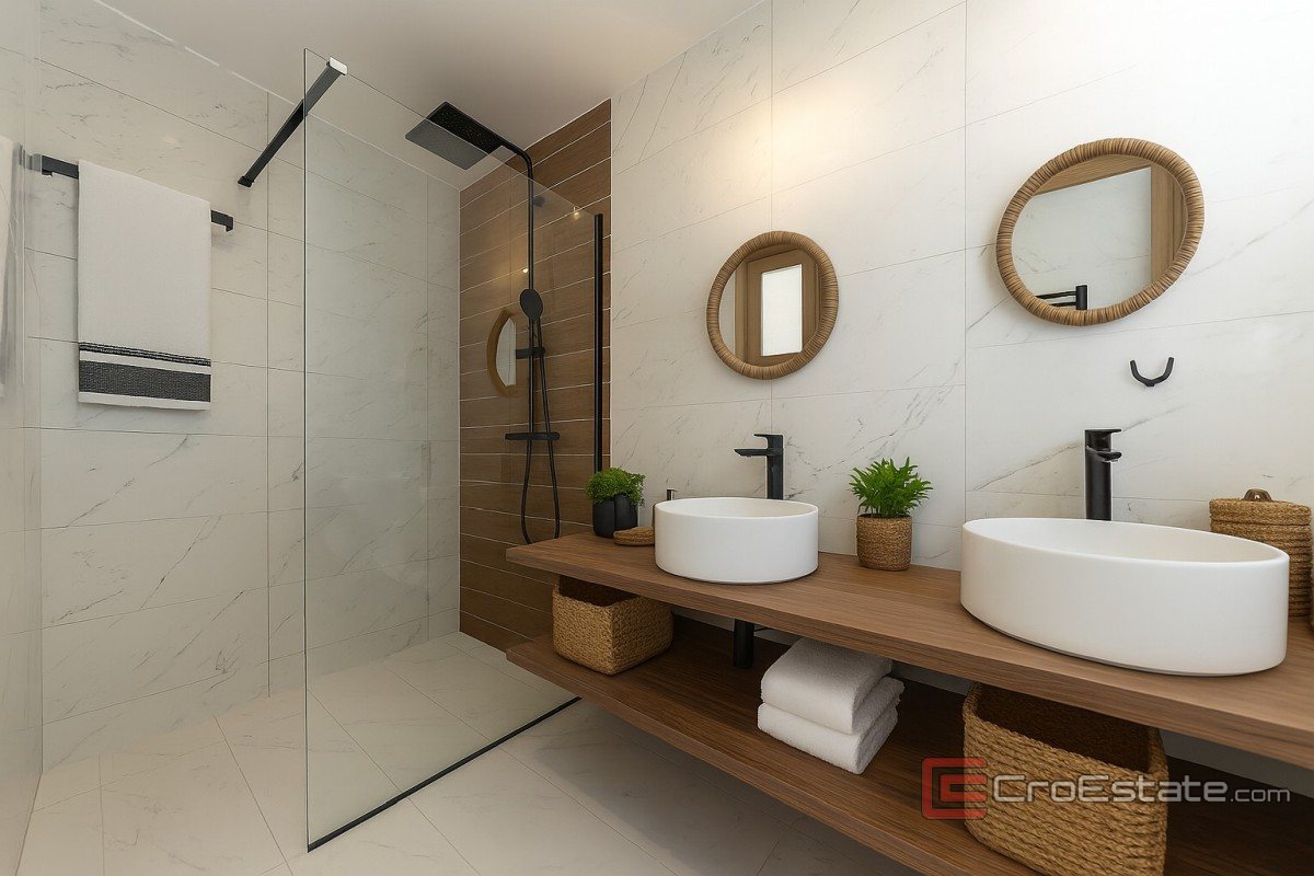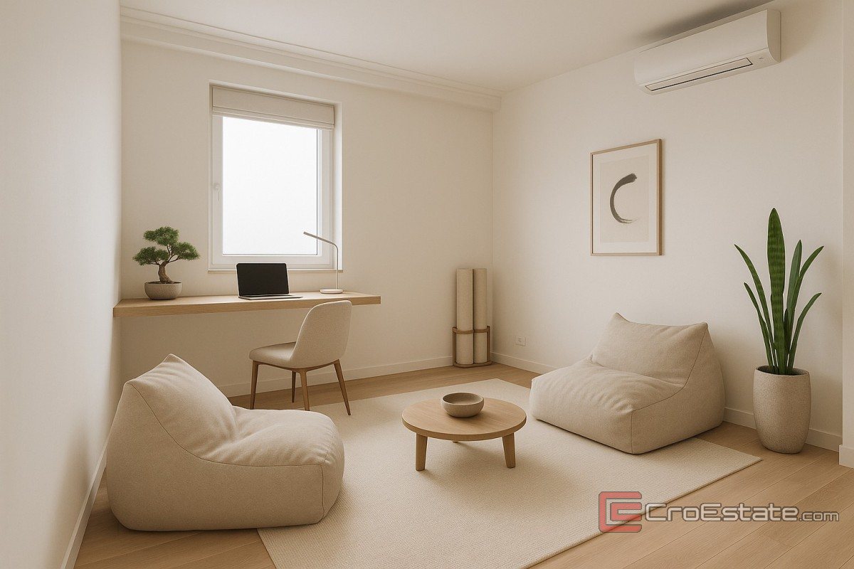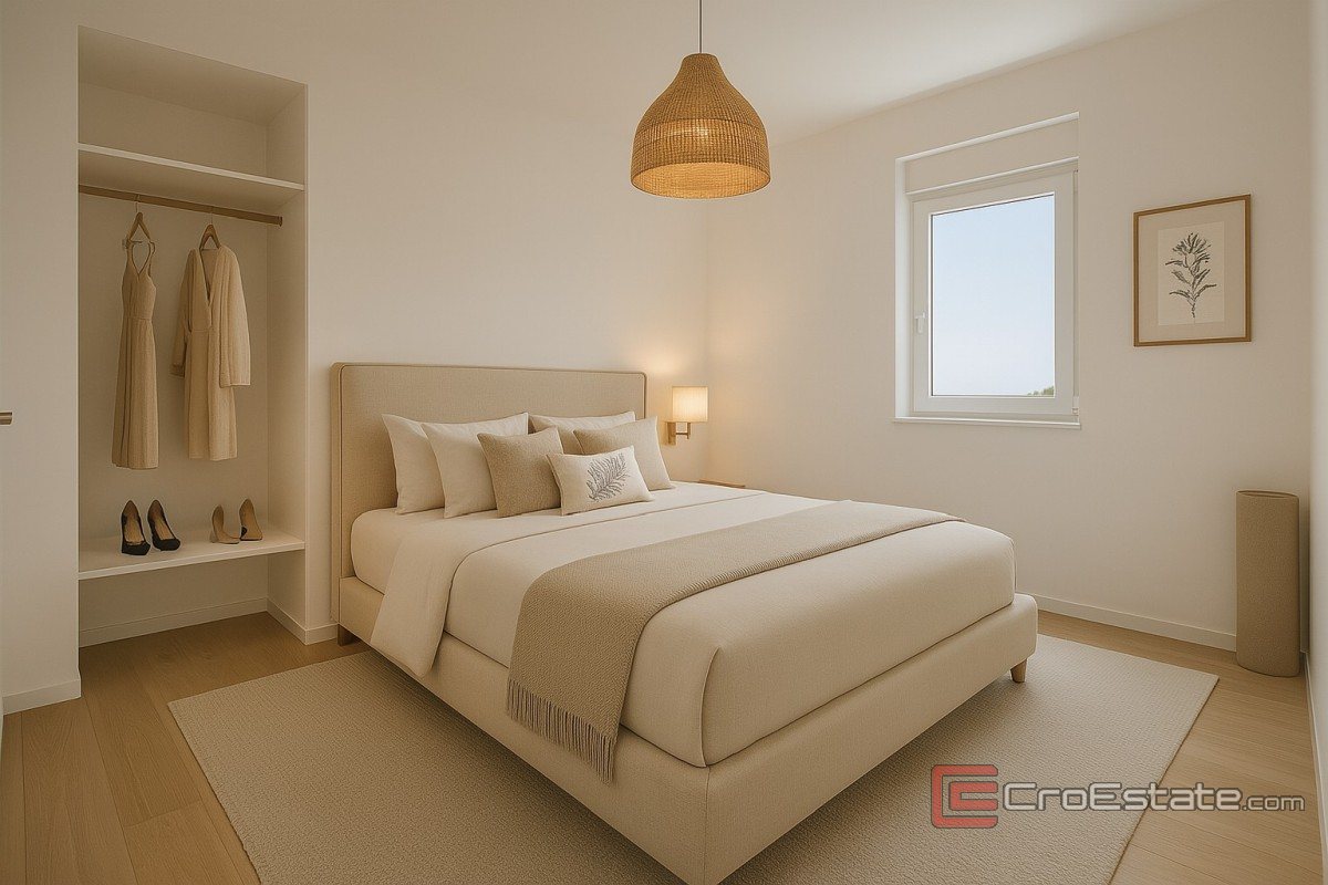 Leiligheten består av entré, kjøkken, stue og spisestue hvorfra det er utgang til overbygd terrasse på 16,30 m2. Leiligheten har tre soverom, bad og toalett. En intern trapp fører til en stor overbygd terrasse på 93,50 m2 med utsikt over Zadar sentrum og havet. Det er også et boblebad på terrassen.