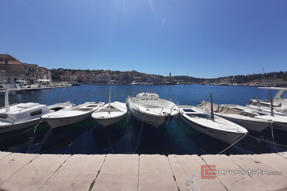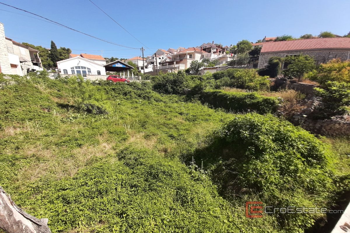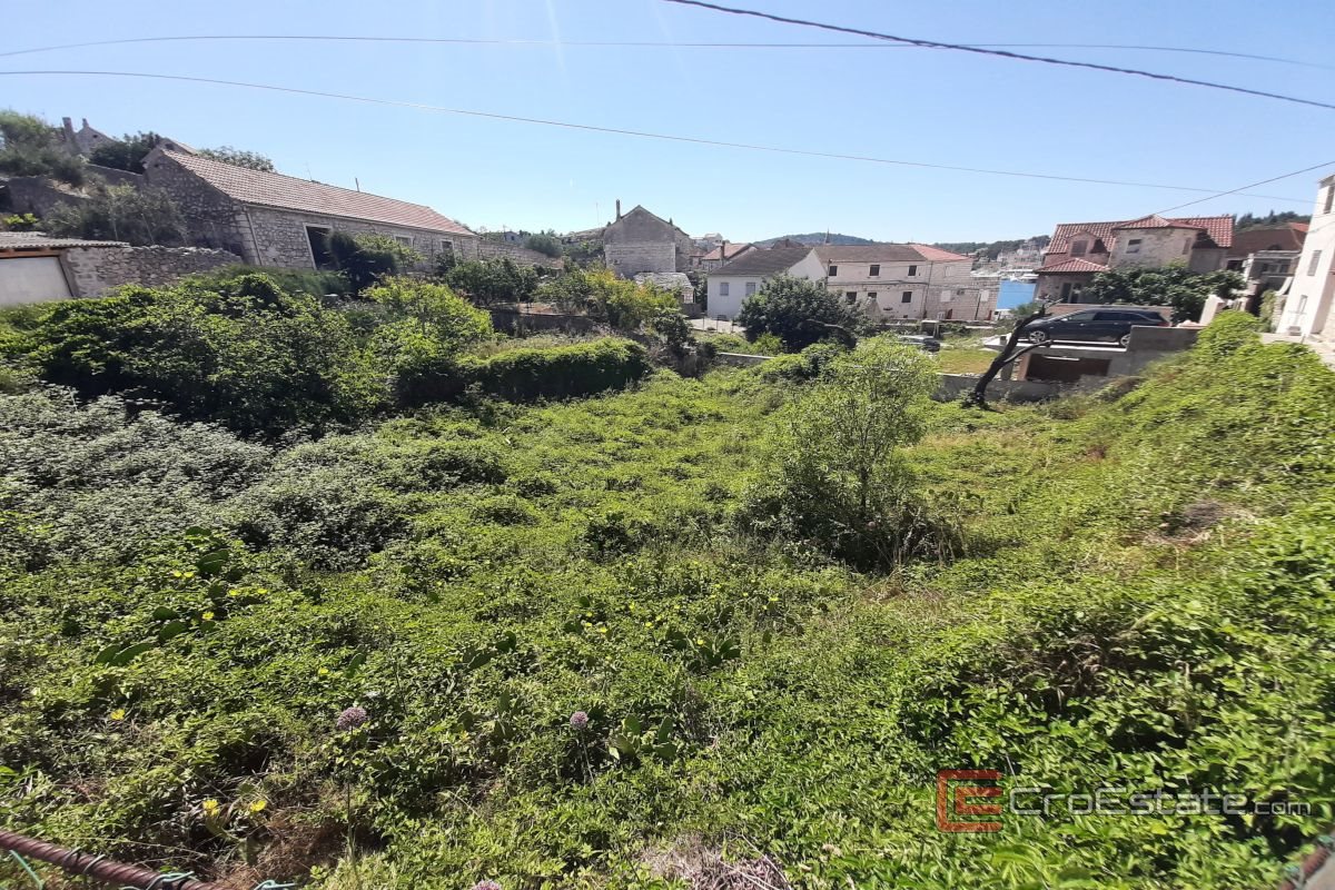 Byggnadstomt, beläget i centrum av Milna på ön Brač, nära havet och vattnet, med delvis skymd utsikt över havet.