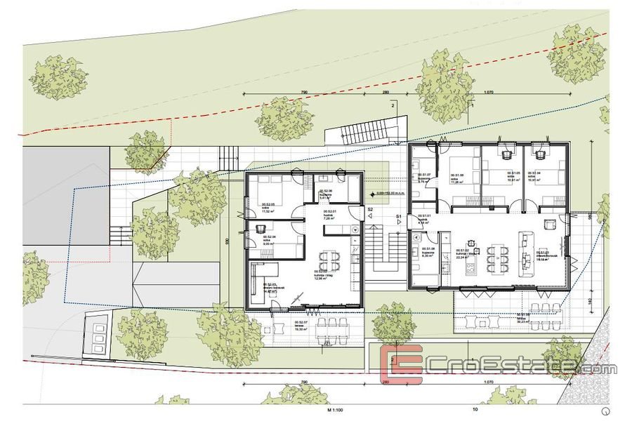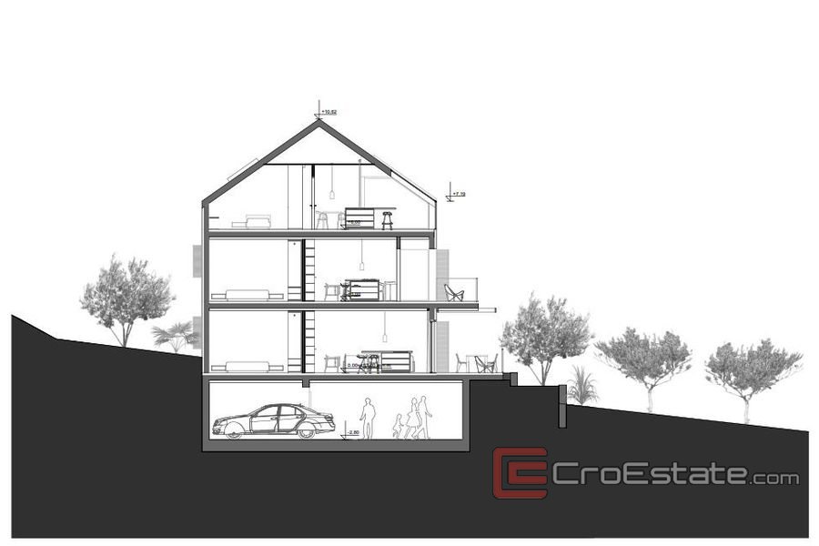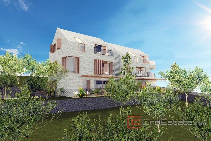 Erbjudandet är en tomt med en yta på 927 m2 med öppen utsikt över havet, med ett byggprojekt på ön Brač.