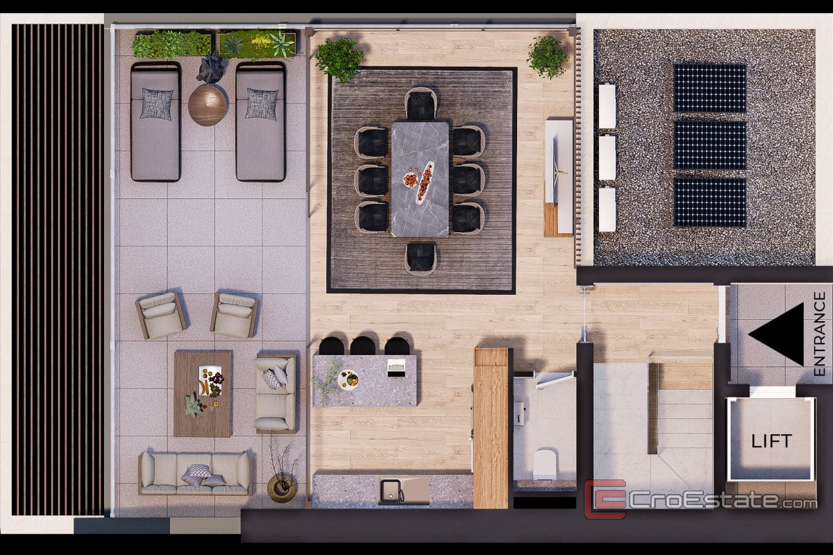 Eine außergewöhnliche Penthouse-Wohnung in Okrug Donji in erster Meeresreihe vereint Luxus und Komfort. Sie erstreckt sich über 99,66 m² Wohnfläche und bietet zusätzlichen Wert durch beeindruckende 79,74 m² Außenfläche. Die Wohnung befindet sich in bester Lage und bietet direkten Zugang zu einer begrünten Sonnenterrasse sowie einen Rundumblick – nach Norden, Süden und Osten.