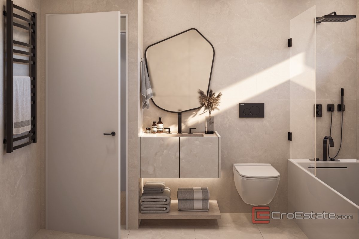 Besonderes Augenmerk wurde auf die Bauqualität und die Materialauswahl gelegt – es wurden hochwertige Fliesen und Sanitärkeramik verwendet, und in jedem Zimmer wurde eine Klimaanlage installiert, die das ganze Jahr über für eine angenehme Temperatur sorgt. Sicherheitstüren und die Möglichkeit einer individuellen Inneneinrichtung in Zusammenarbeit mit professionellen Innenarchitekten heben den Standard dieser Immobilie zusätzlich hervor.