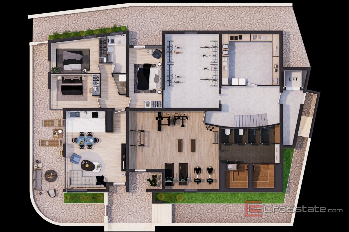 Die Innenaufteilung der Wohnung wurde sorgfältig für maximalen Komfort konzipiert. Das Erdgeschoss verfügt über drei Schlafzimmer, ein modernes Badezimmer, einen Flur und einen geräumigen Wohnbereich, der durch Glaswände mit einer Terrasse mit Meerblick verbunden ist. Das Gebäude ist mit einem Aufzug ausgestattet, was die Funktionalität und Zugänglichkeit des Raumes weiter erhöht.