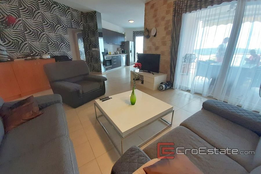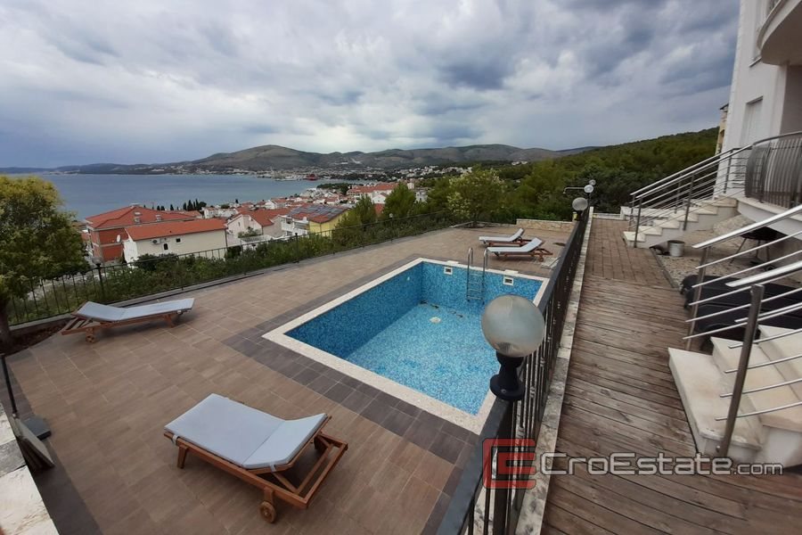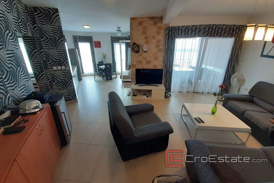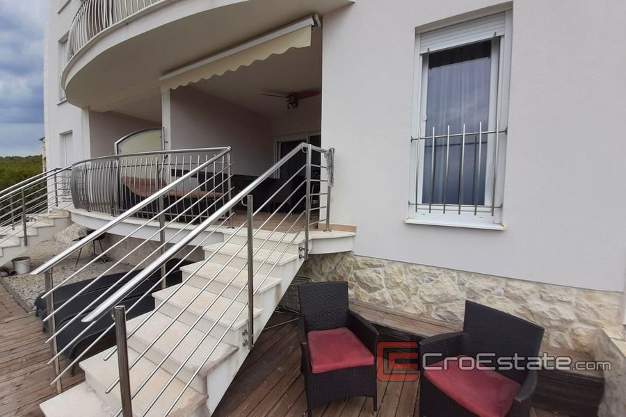 Elegante Wohnung mit zwei Schlafzimmern zum Verkauf auf der Insel Ciovo im Erdgeschoss eines Wohngebäudes mit wunderschönem Meerblick und einem Gemeinschaftspool für Mieter.