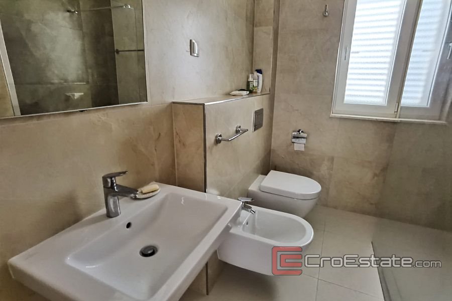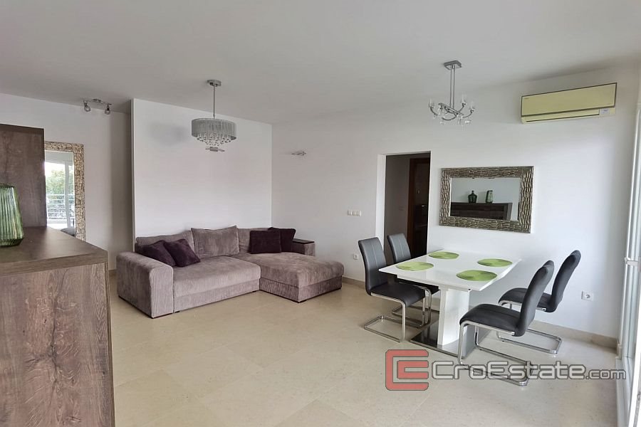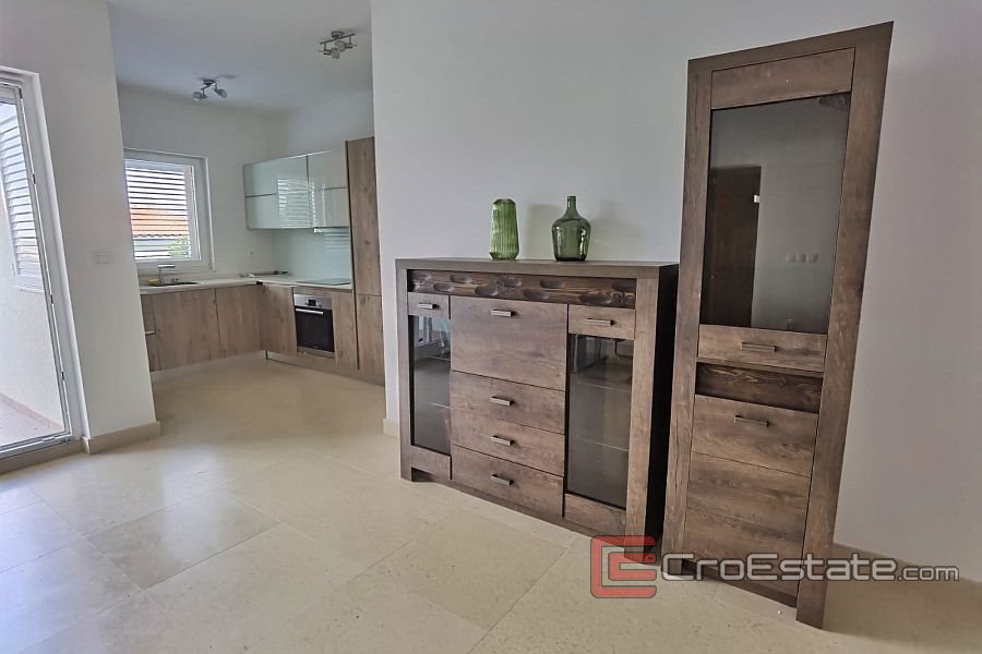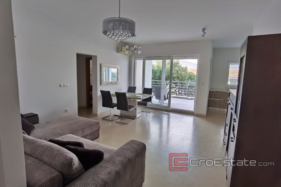 Eine schöne Zweizimmerwohnung zur Langzeitmiete in attraktiver Lage, zweite Reihe zum Meer, Wohnfläche 63 m2 und eine Terrasse von 43 m2 mit wunderschönem Blick auf das Meer. Die Wohnung befindet sich im Erdgeschoss und besteht aus einer Küche mit Esszimmer und Wohnzimmer, zwei Schlafzimmern und einem Badezimmer.