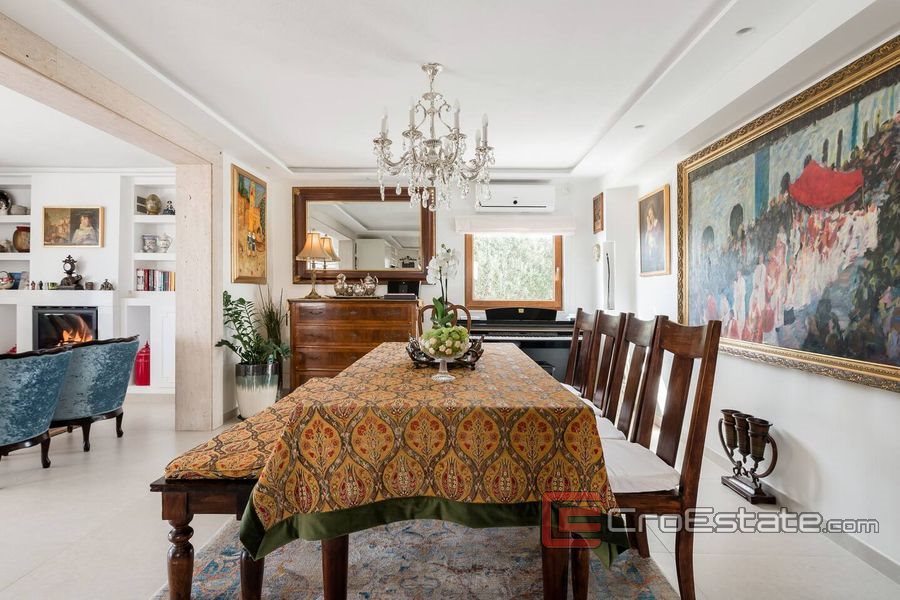 Första våningen består av badrum med bastu, rymligt kök med matplats och vardagsrum med utgång till terrassen där det finns en uppvärmd hydromassagepool på 24 m2 och utemöbler.
