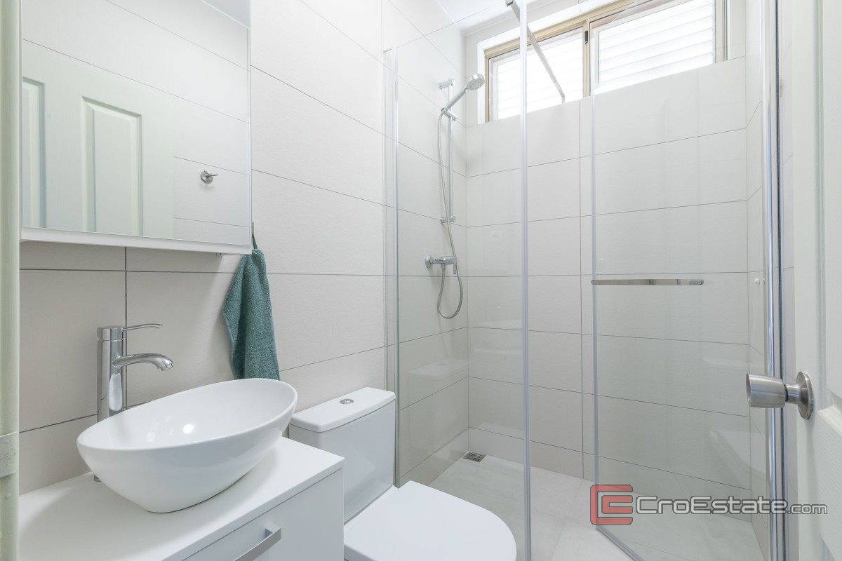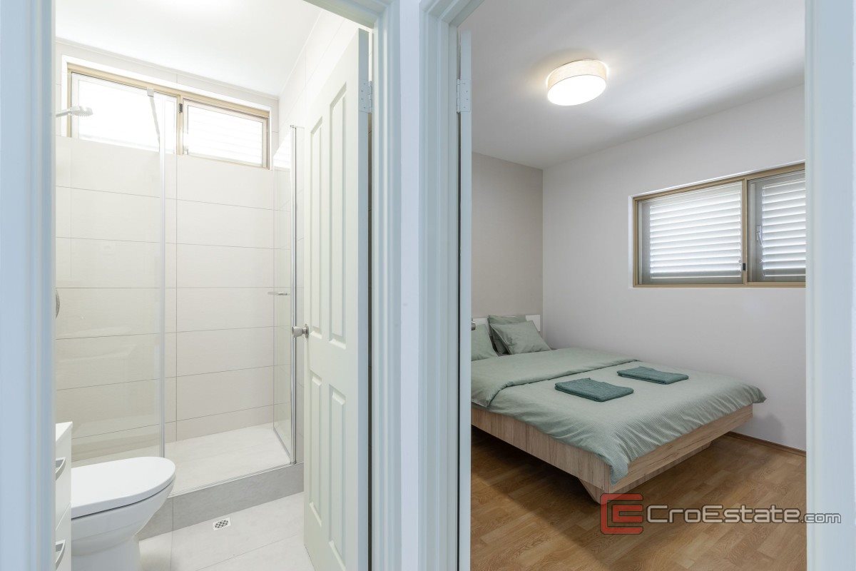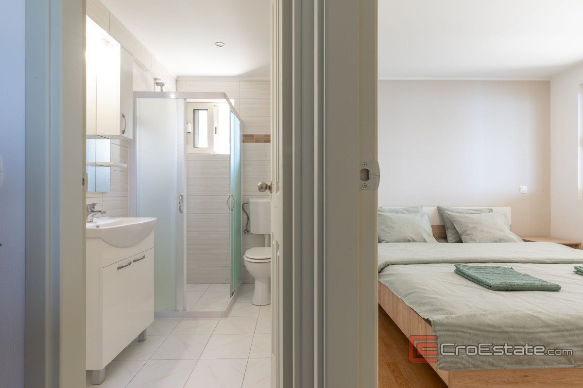 Das Haus besteht aus drei separaten Wohneinheiten: einer Drei-Zimmer-, einer Zwei-Zimmer- und einer Ein-Zimmer-Wohnung, jeweils mit eigenem Eingang und Terrasse. Dies ermöglicht eine ideale Kombination aus privatem Wohnen und touristischer Vermietung. Die Innenräume sind elegant eingerichtet und verfügen über moderne Bäder mit ebenerdigen Duschen. Zwei 100-Liter-Boiler sorgen für ausreichend Warmwasser. Das Dach ist 20 cm dick wärmegedämmt und erreicht dadurch eine hervorragende Energieeffizienz. Im Dachgeschoss befindet sich ein leerer Raum, der als Abstellraum dient. Im Erdgeschoss befinden sich eine Waschküche und weitere Hauswirtschaftsräume.