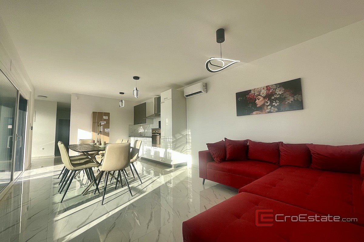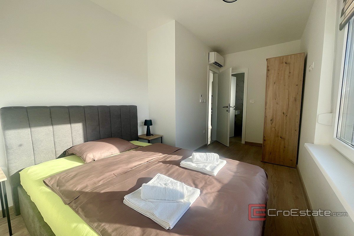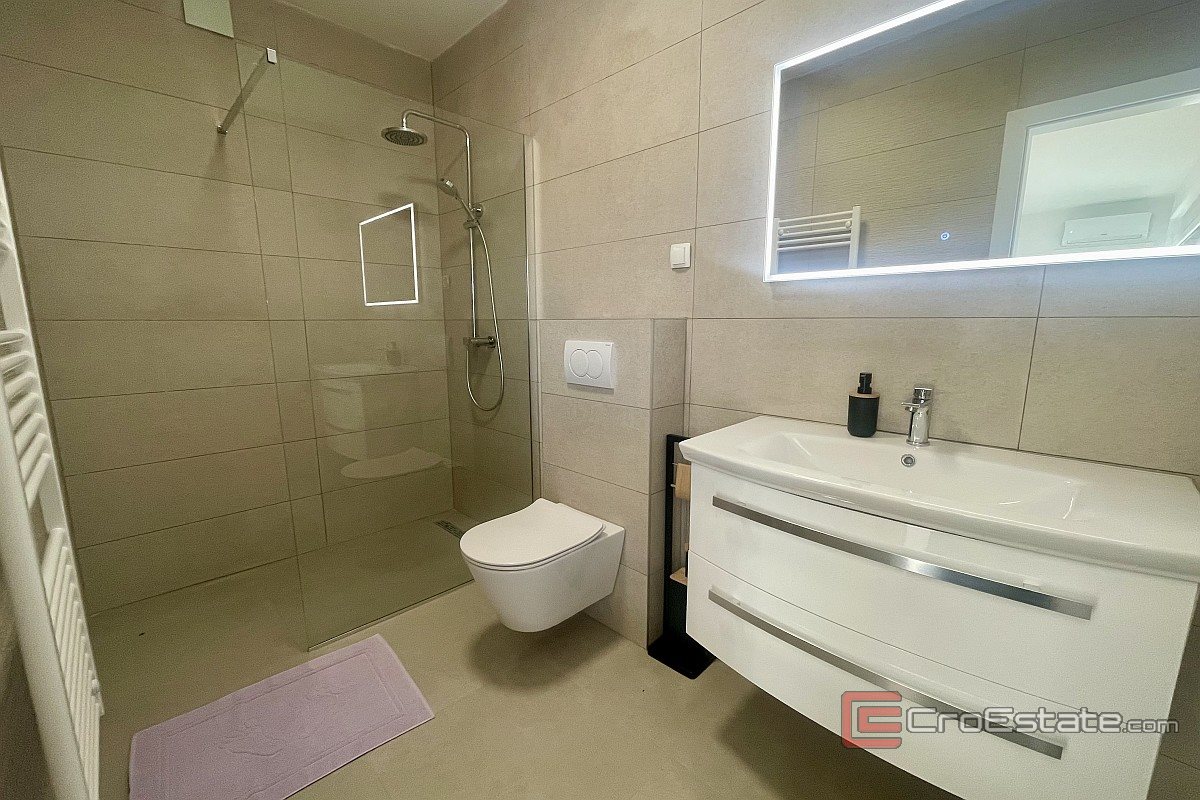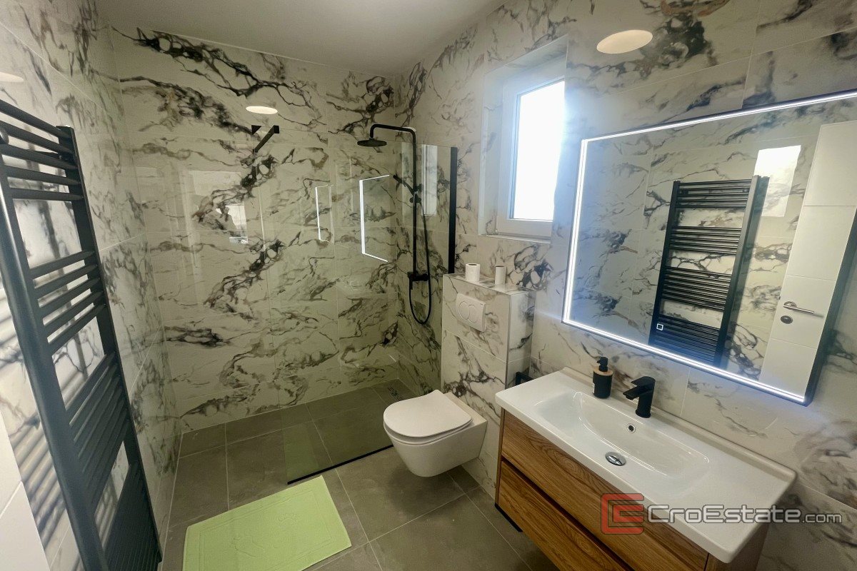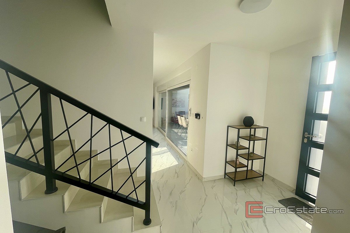 I närheten av staden Krk, i ett lugnt läge, säljs ett nytt hus med modern arkitektur och pool. Huset ligger på en tomt på 500 m² och boytan är 160 m² fördelad över bottenvåningen och första våningen. Bottenvåningen har två sovrum, varav ett har eget badrum, och ett öppet vardagsrum med kök och matplats, med naturligt ljus och tillgång till en täckt terrass och trädgård. På första våningen finns tre sovrum med eget badrum, varav ett har tillgång till en loggia. Trädgården är anlagd och inkluderar en uppvärmd pool på 40 m², en solterrass, ett sommarkök och två parkeringsplatser. Kvalitetsmaterial och utrustning användes för byggnationen, inklusive keramiska golvbeläggningar, sanitetsartiklar av hög kvalitet, multisplit-luftkonditionering, golvvärme med värmepump, PVC-snickerier med rulljalusier i aluminium och myggnät, larmsystem, videoövervakning och säkerhetsdörrar.