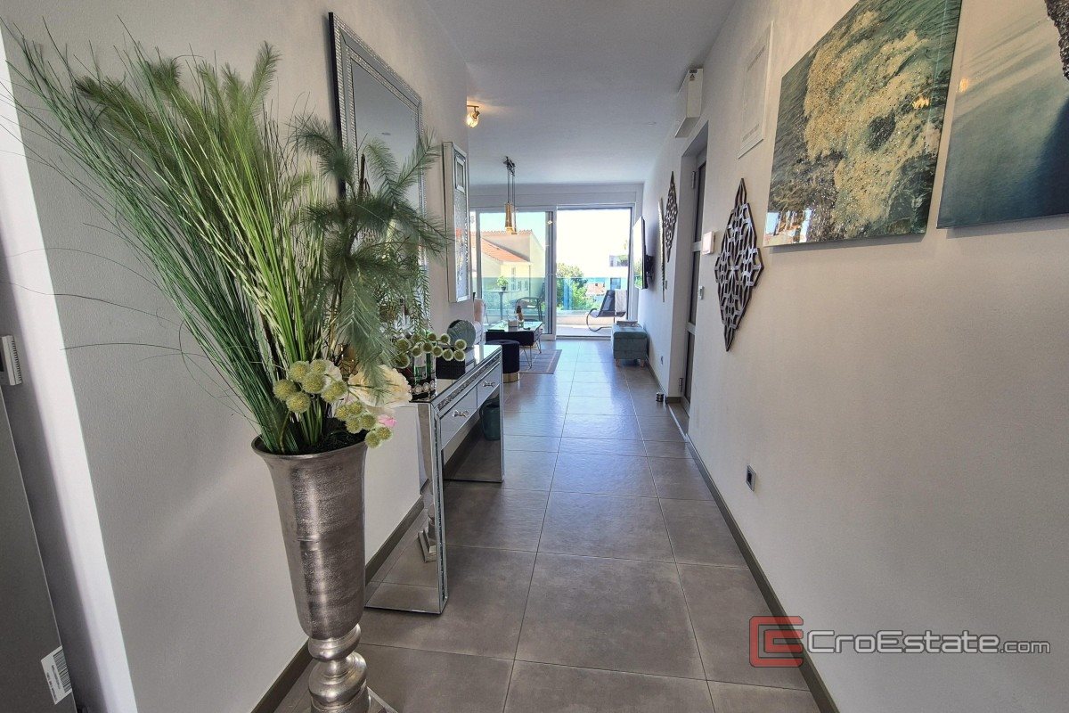 I staden Krk säljs en bekväm lägenhet med en nettoyta på 106,60 m², belägen på första våningen i en byggnad med fyra bostäder. Den består av en hall, tre sovrum, två badrum, ett kök med matsal och ett vardagsrum med tillgång till en täckt terrass med havsutsikt. En ytterligare terrass, som nås från matsalen, ger avskildhet och lugn. Lägenheten har en trädgård på 82 m², med egen pool och utomhusgrill. I byggnadens källare finns ett förråd på 12 m², och fastigheten har även två täckta parkeringsplatser. Byggnaden är byggd med kvalitetsmaterial, utrustad med hiss, och lägenheten har golvvärme i alla rum och luftkonditionering för uppvärmning och kylning. Aluminiumsnickerier och en elektrisk markis är installerade. Den säljs fullt möblerad och utrustad och är omedelbart redo att användas.