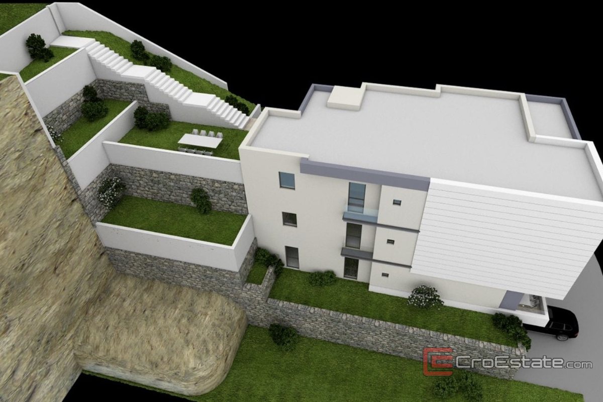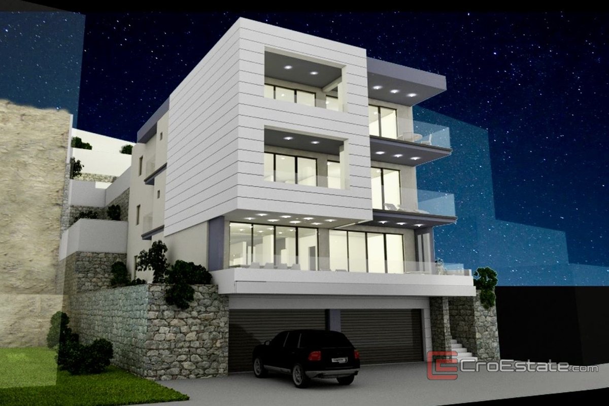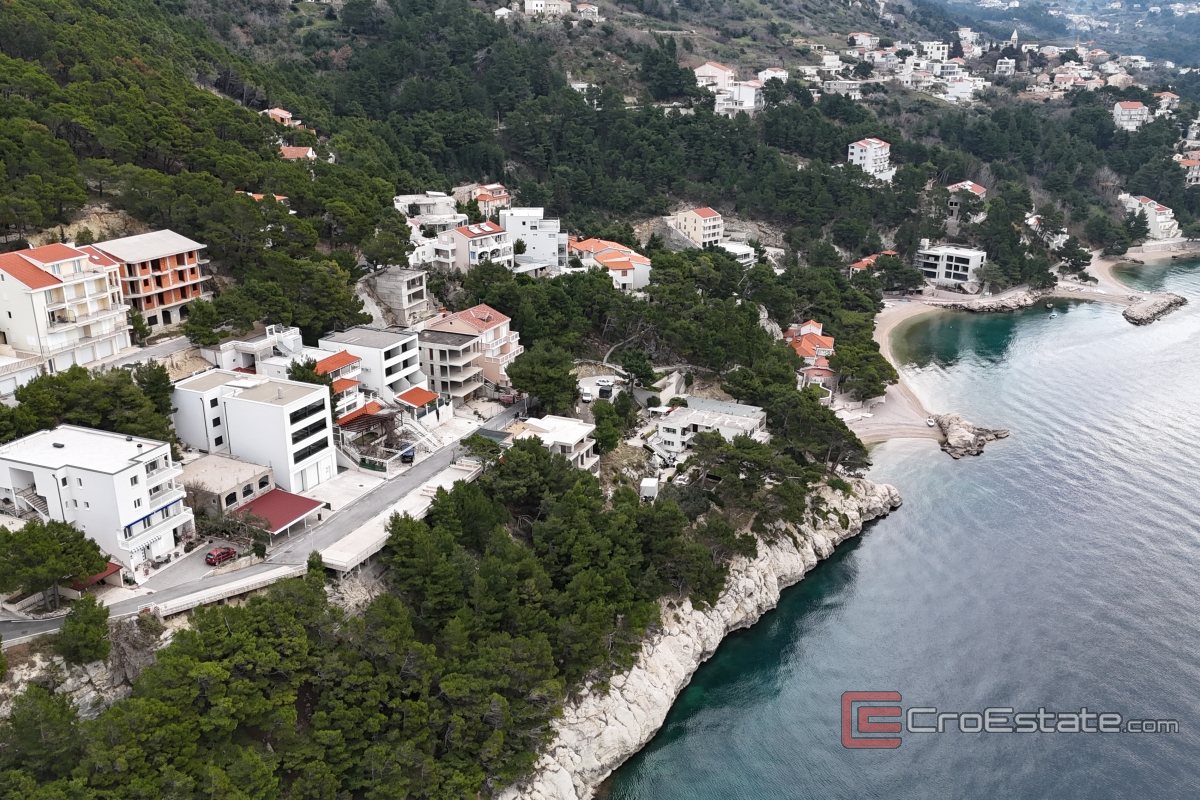 Byggtomt på 430 m² med giltigt bygglov för uppförande av ett bostadshus ligger i Brela, i den bebyggda delen av bebyggelsen. Tomten är söderläge och erbjuder en öppen panoramautsikt över havet.
