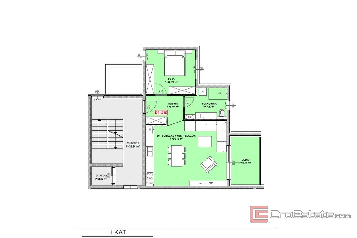 Till salu finns en lägenhet på 63 m², belägen på första våningen i en modern nybyggnad med hiss, i omedelbar närhet av havet. Vardagsrummet med kök och matsal utgör husets centrum, medan ett sovrum ger avskildhet och komfort. Vardagsrummet öppnar upp mot en loggia som erbjuder en trevlig vrå för avkoppling och att njuta av naturen med havsutsikt.