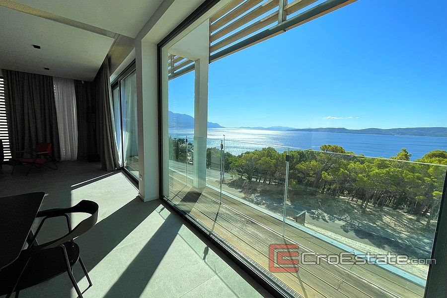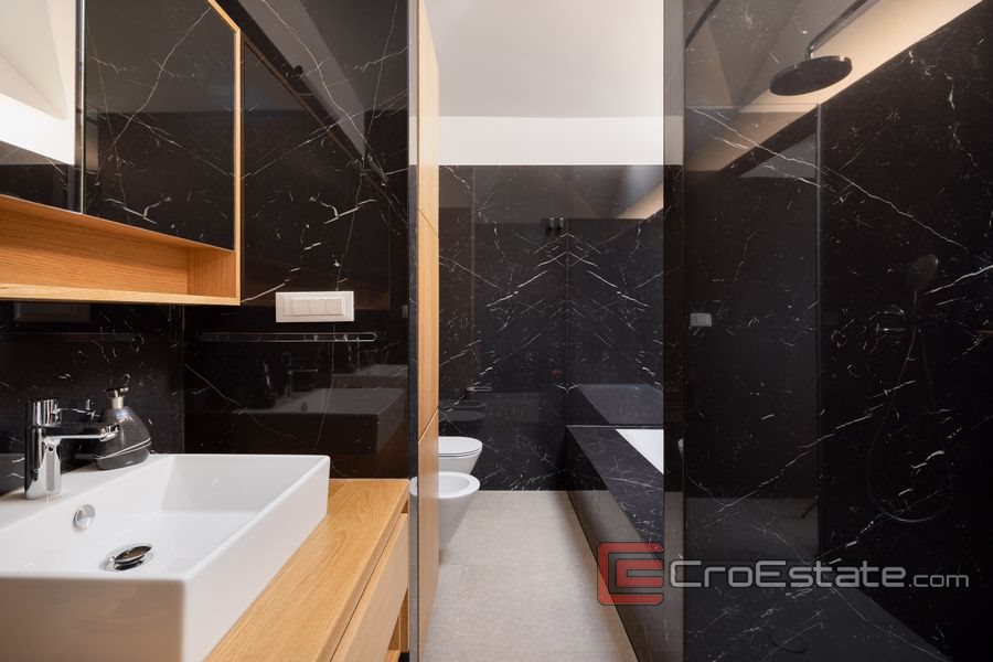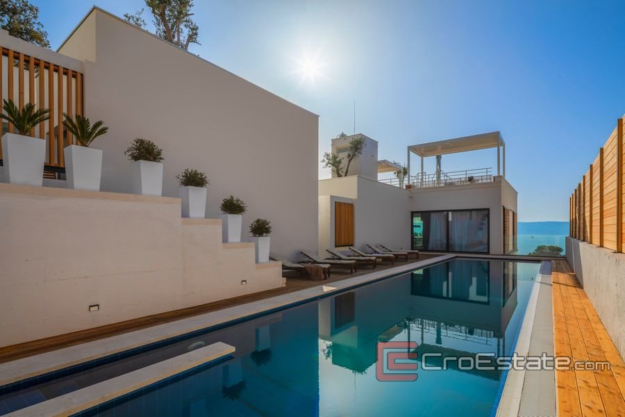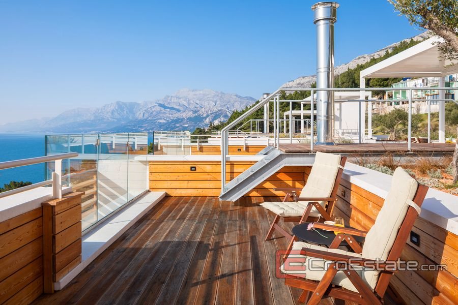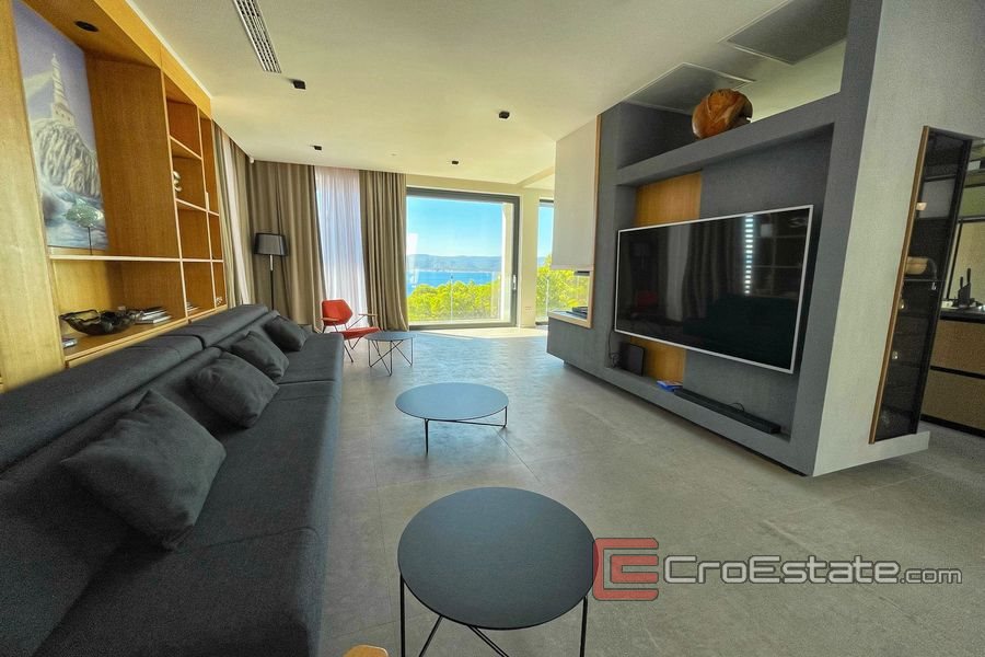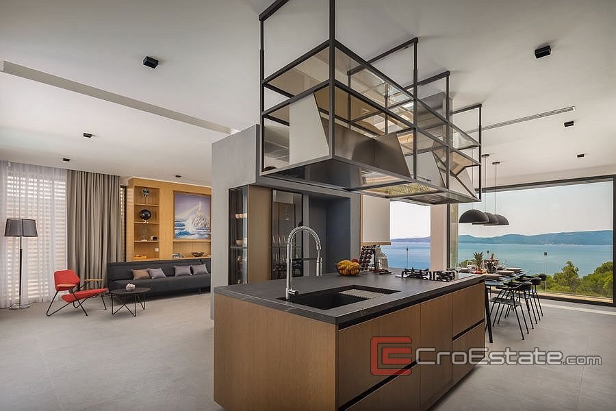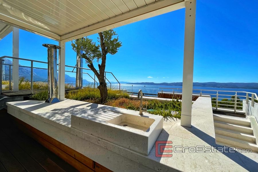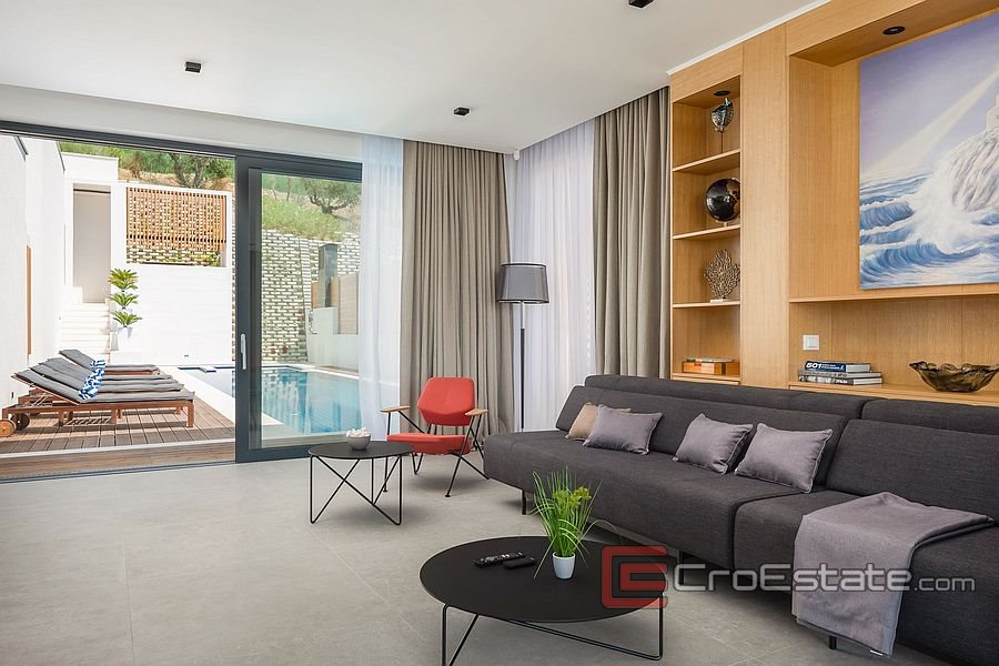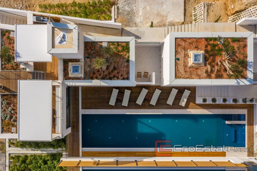 Die Villa wurde sorgfältig entworfen, um ihre prestigeträchtige Lage am Meer voll zur Geltung zu bringen und bietet aus fast jedem Blickwinkel einen wunderschönen Blick auf die Adria. Und es ist auch spezifisch für die grünen Dächer des Zimmers und des Wohnzimmers, auf jedem dieser Dächer befindet sich ein Olivenbaum, umgeben von mediterranen Pflanzen. Gründächer sind nicht nur ein ästhetisches Detail, sondern dienen auch der Wärmedämmung der Räume, in denen sie sich befinden, was Energie spart.