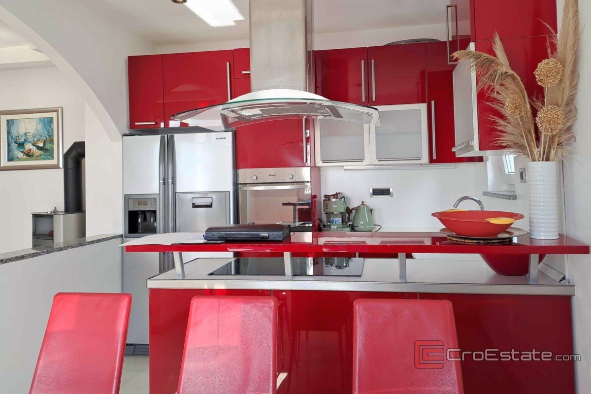 Till salu finns en lägenhet på andra våningen i en villa byggd 2011 i Ičići, belägen på en tomt på 1 100 m². Lägenheten består av hall, kök, vardagsrum, tre sovrum, två badrum och en terrass, med en total boyta på 128,69 m². Lägenheten inkluderar också en entréterrass med en trappa på 4,26 m² och en krog på gården på 40,52 m².
