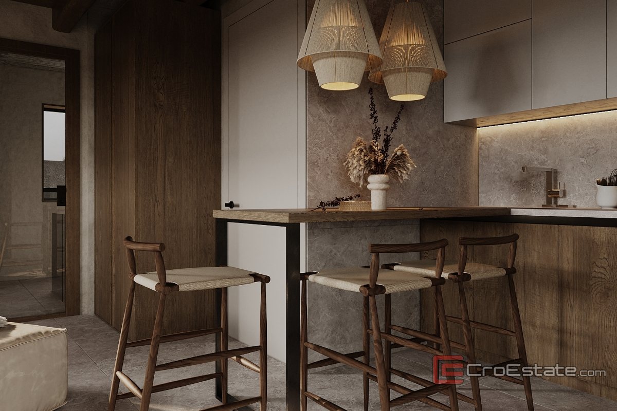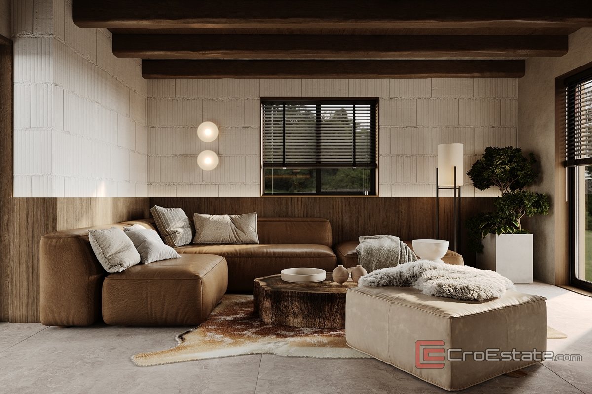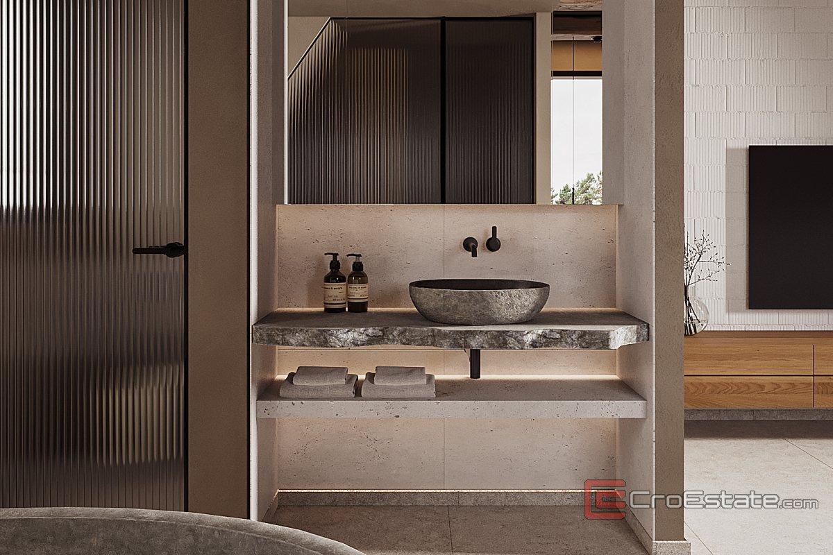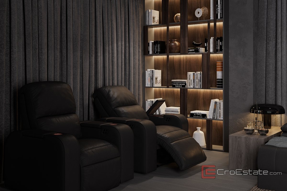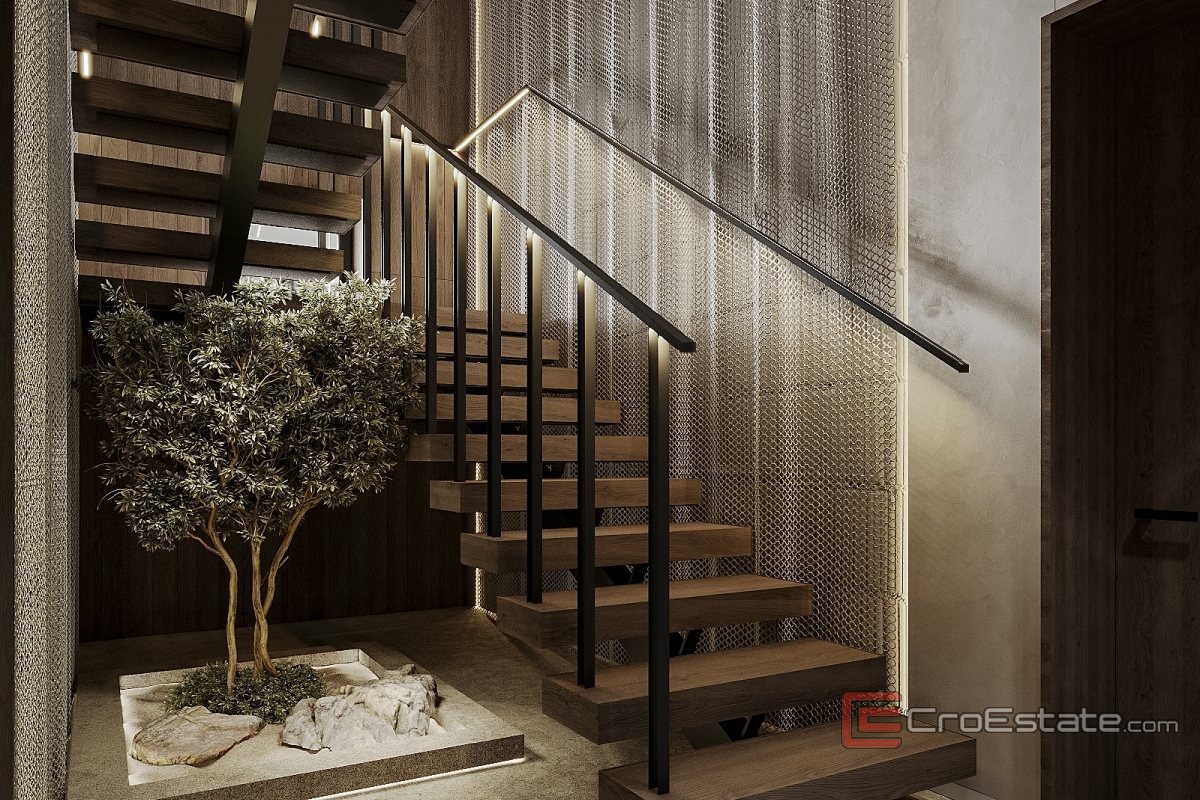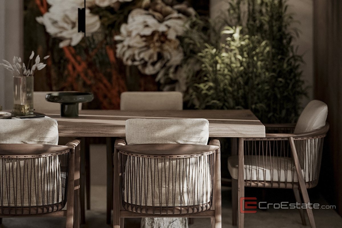 Das Interieur der Villa ist einzigartig gestaltet und mit handgefertigten Elementen versehen. Das Haupthaus bietet ca. 300 m² luxuriöse Wohnfläche, darunter ein geräumiges Wohnzimmer, zwei Schlafzimmer, eine professionelle Küche und ein privates Heimkino von ca. 50 m². Auf einem fast 3000 m² großen Grundstück befinden sich zwei Gebäude: die Hauptvilla und ein separates Wellness-Apartment mit Sauna und Entspannungseinrichtungen.