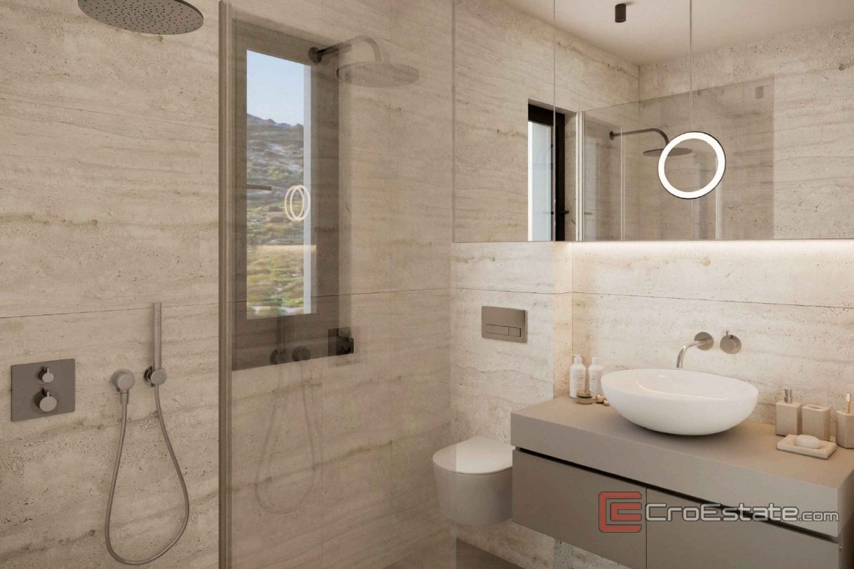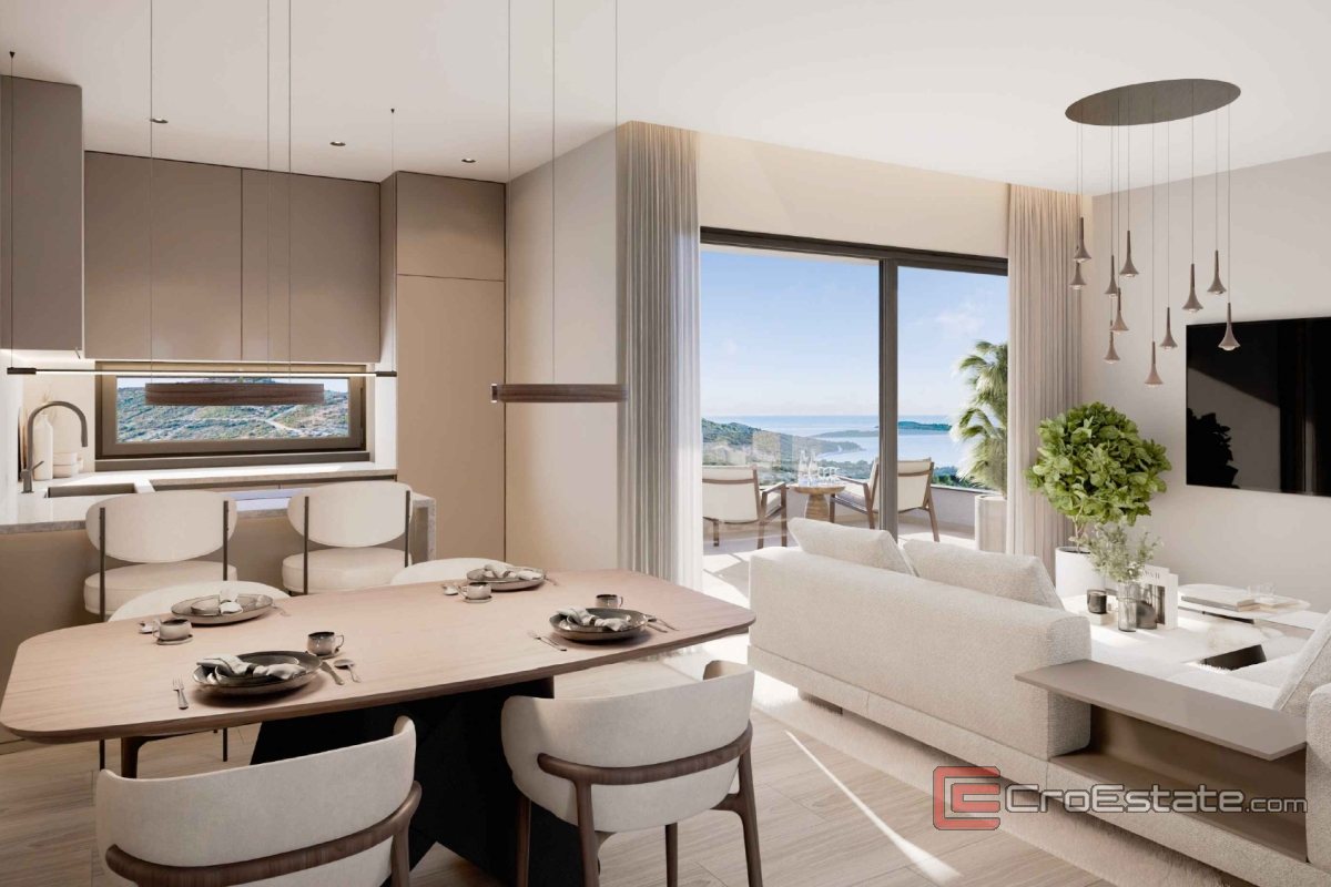 Die Wohnung besteht aus einem Eingangsbereich, der zu einem Badezimmer, zwei Schlafzimmern, einer Küche und einem offenen Raum führt, in dem sich das Wohnzimmer und das Esszimmer befinden. Vom Wohnzimmer aus hat man direkten Zugang zur Loggia, die einen wunderschönen Blick auf das Meer und die Stadt Primošten bietet.