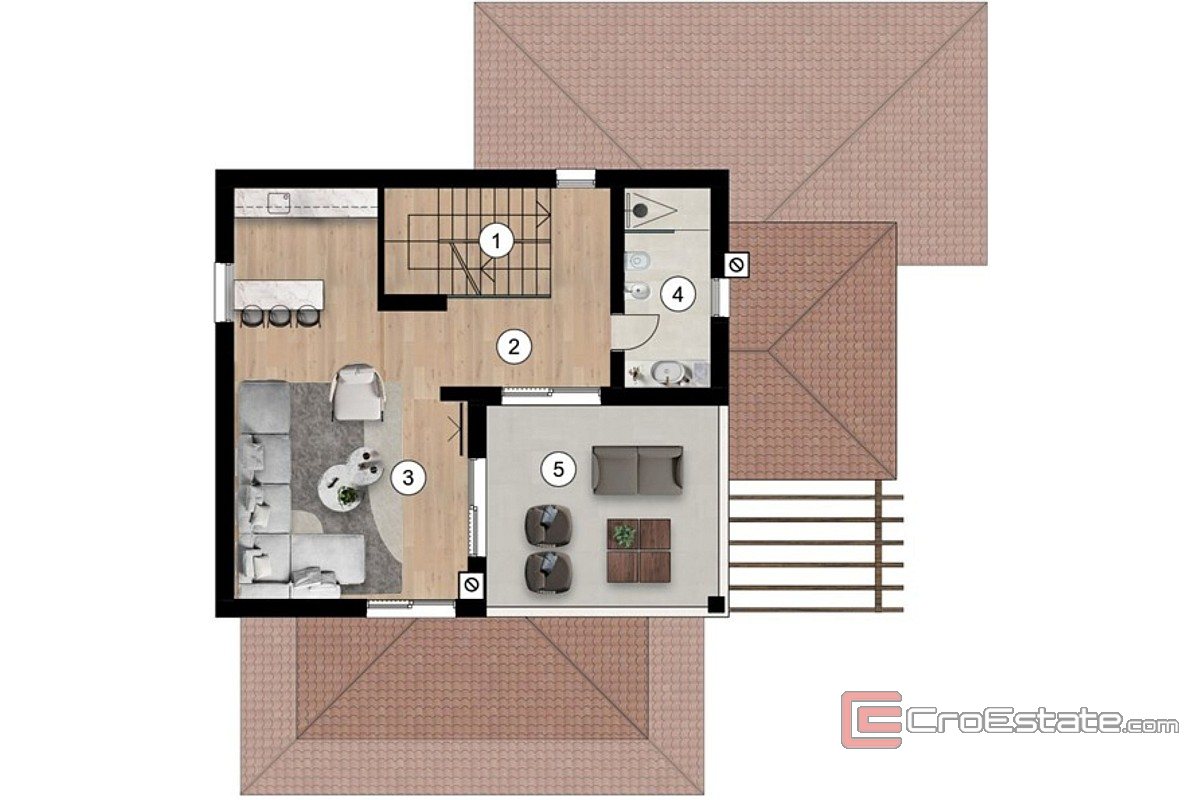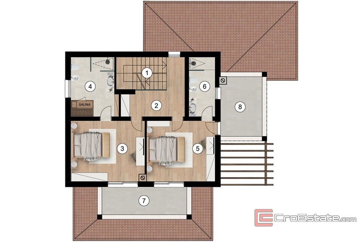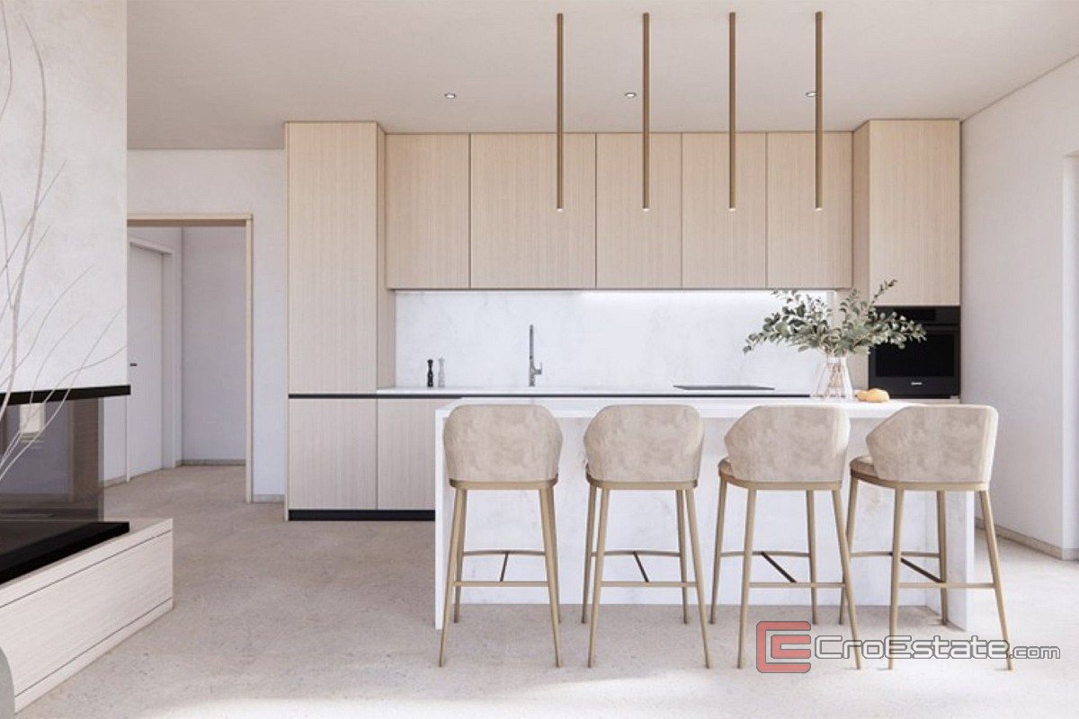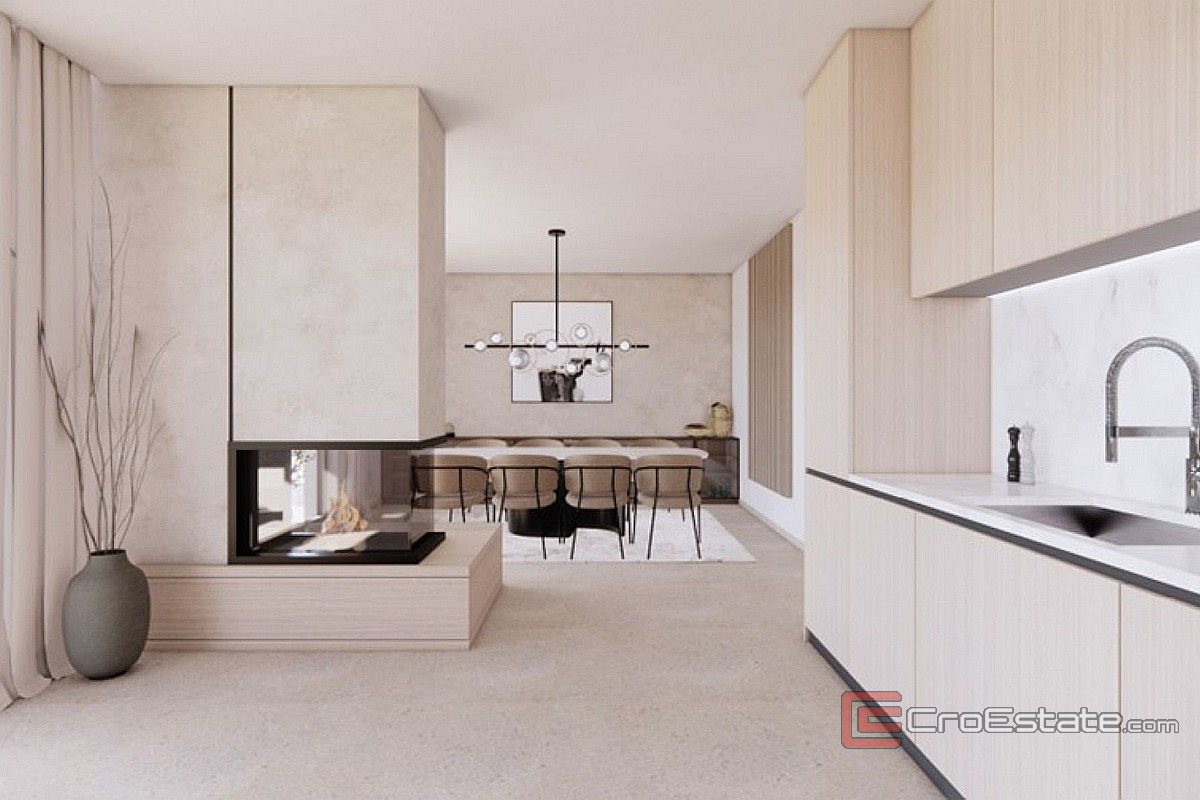 Das Haus erstreckt sich über drei Etagen und verfügt über einen Swimmingpool und drei Parkplätze. Im Erdgeschoss befinden sich ein geräumiges, offenes Wohnzimmer mit Küche und Esszimmer, ein Badezimmer, ein separates WC und ein Schlafzimmer. Im ersten Stock befindet sich eine luxuriöse Master-Suite mit eigenem Bad und Sauna, ein weiteres Schlafzimmer mit Bad und eine große überdachte Terrasse, ideal zum Entspannen. Im zweiten Stock befindet sich ein zusätzliches Wohnzimmer mit Zugang zu einer großen Terrasse. Bei der Gestaltung der Villa wurde Wert auf Komfort, Funktionalität und modernes Design gelegt.