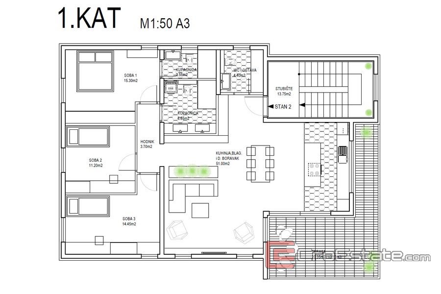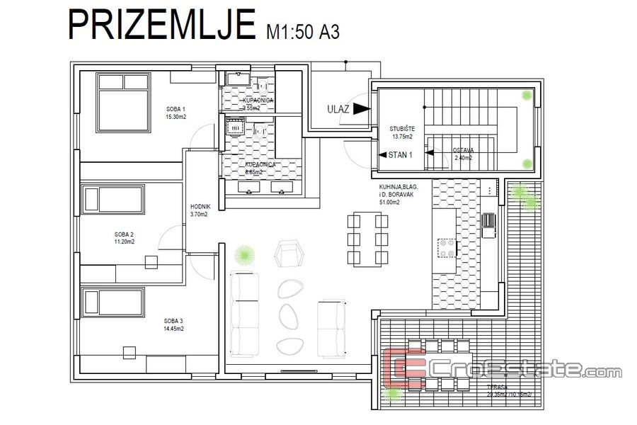 Byggnaden består av tre våningar, på vilka tre lägenheter är anordnade. Varje lägenhet består av en hall, tre sovrum, två badrum, ett öppet kök och matsal med vardagsrum, som har tillgång till en rymlig terrass med en total yta på 20 m2, med utsikt över havet .