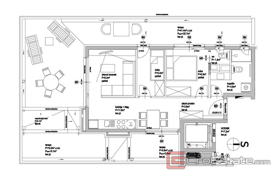 En rymlig terrass erbjuder möjligheten att installera en jacuzzi och en grill.