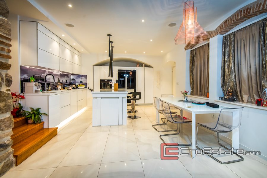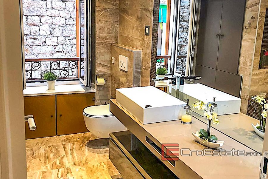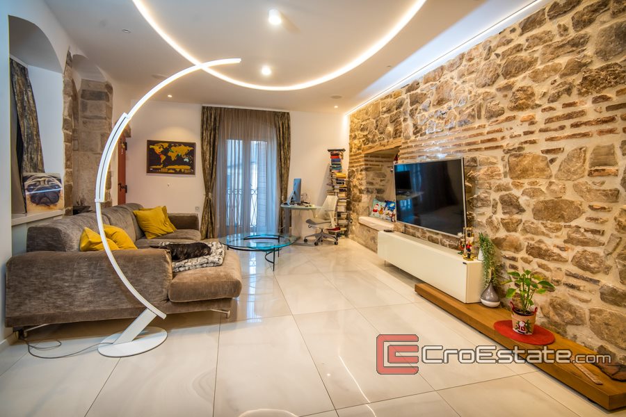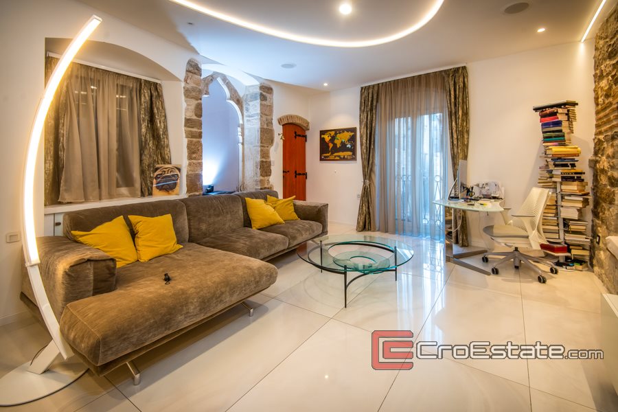 Lyxigt renoverad lägenhet med tre sovrum i Diocletianus palats, boyta 111 m2. Ligger på 1: a våningen i Gamla stan i Split, nordvästlig orientering. 2 minuters promenad från hamnen och vattnet i Split. 5 min promenad från tåg- och busstationen och stadens strand Bačvice.