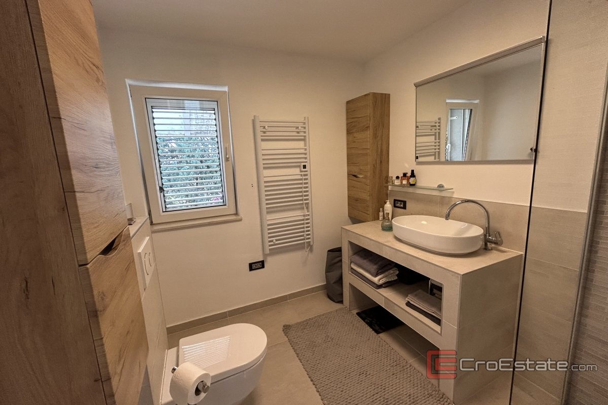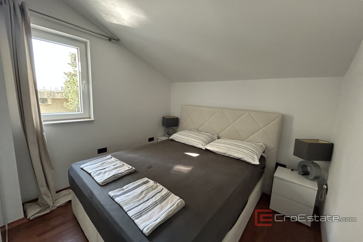 Eine außergewöhnliche Penthouse-Wohnung mit vier Schlafzimmern in Meje steht in erster Meeresreihe im zweiten Stock des Hauses zum Verkauf. Sie befindet sich in einer ausgezeichneten und begehrten Mikrolage und ist nach allen vier Himmelsrichtungen ausgerichtet.