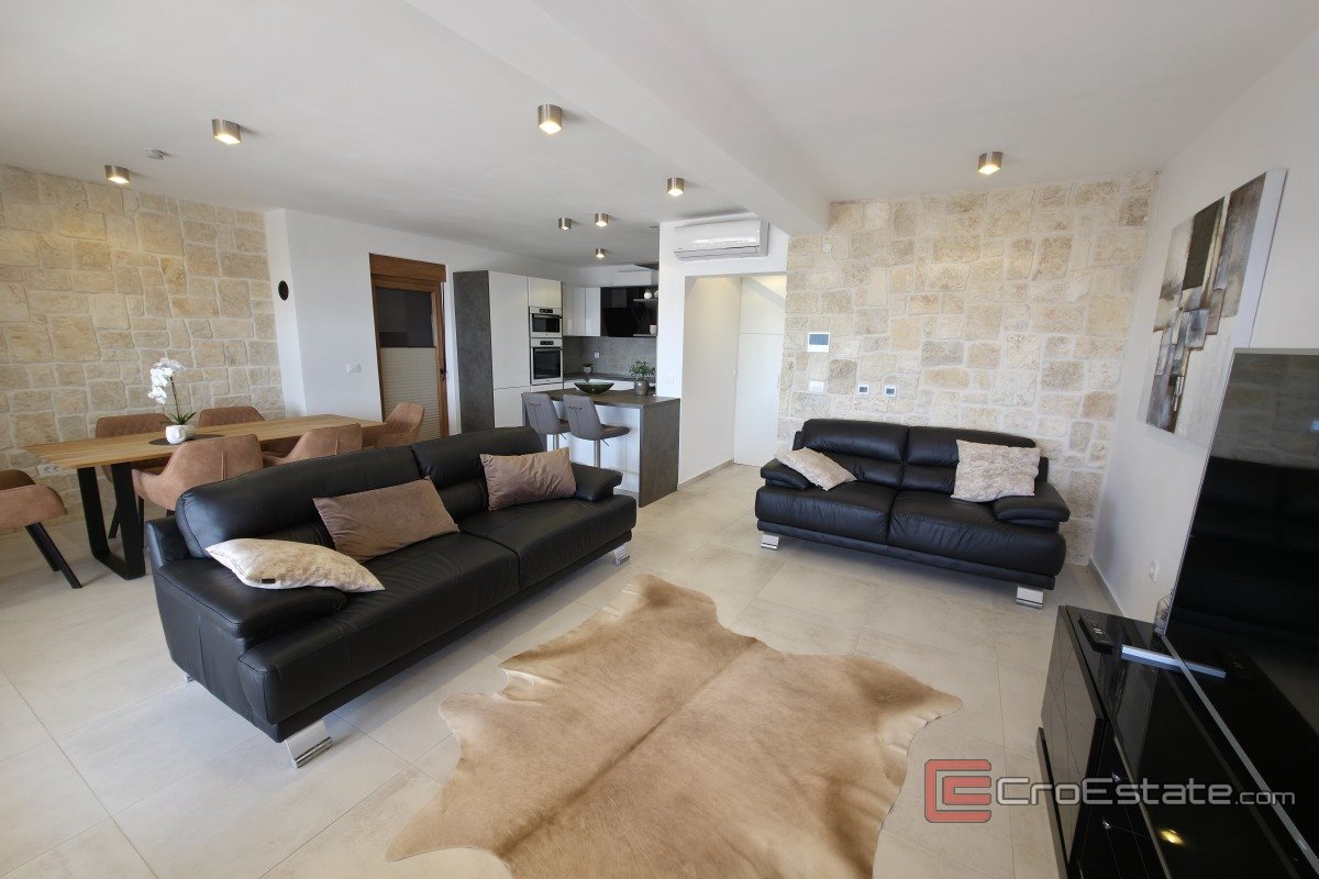 Eine moderne Innentreppe führt in den ersten Stock mit drei Schlafzimmern. Jedes Schlafzimmer verfügt über ein eigenes Badezimmer und Zugang zur Terrasse. Dank der hervorragenden Lage des Hauses bieten fast alle Zimmer einen freien und unverbauten Meerblick.