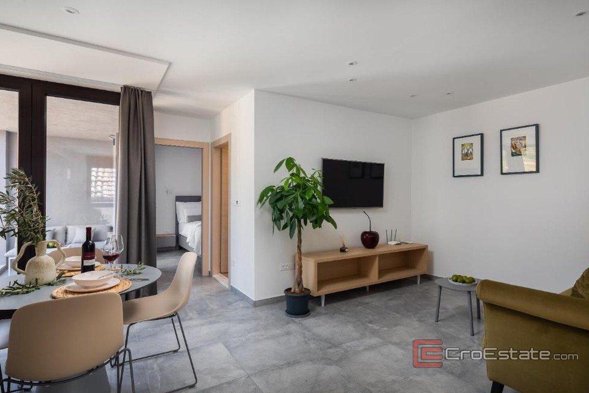 En modern lägenhet säljs på ett attraktivt läge i Komiža, belägen på första våningen i en urban villa. Fastigheten byggdes 2020 och ligger på en lugn gata inom gågatan, omgiven av traditionella stenhus och natur, vilket ger fullständig lugn och en autentisk ö-atmosfär.