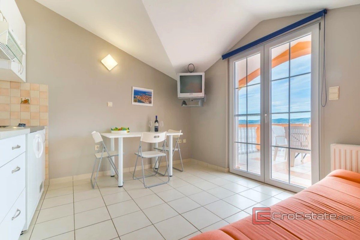 Bottenvåning: Stor lägenhet i två plan med vardagsrum, kök, matsal, två sovrum och ett badrum på nedre plan. På övervåningen finns ytterligare ett rum, kök, matsal, badrum och en terrass med havsutsikt.